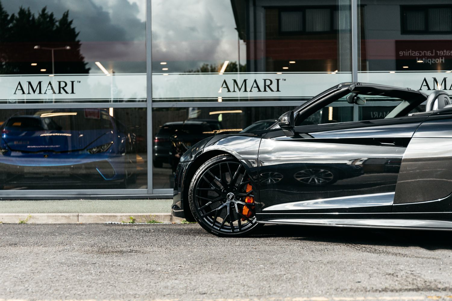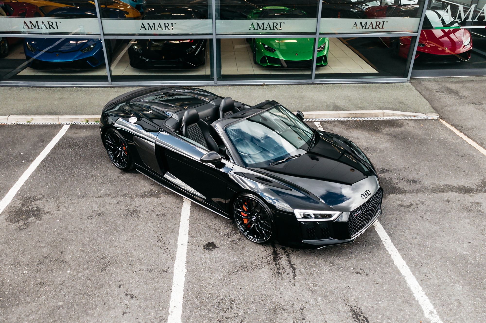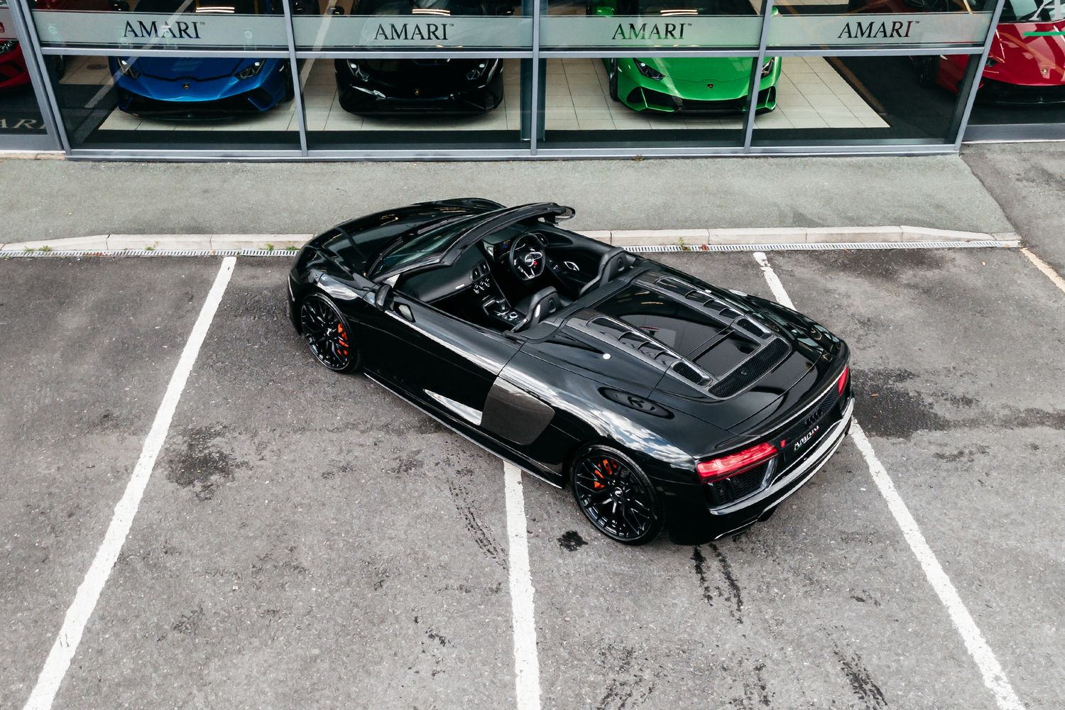 This particular example of the Audi R8 V10 Plus Quattro Spider was supplied new in March 2018, 18 Registered. Presented to you in Mythos Black Metallic, featuring 20" 10-Spoke Y Design Forged Alloy Wheels in Gloss Black, also boasting exterior Carbon Fibre. The interior is upholstered in Black, Fine Nappa Leather Upholstery. This vehicle has covered a mere 13,500 Miles by 7 Owners from New. The full specification is outlined below: