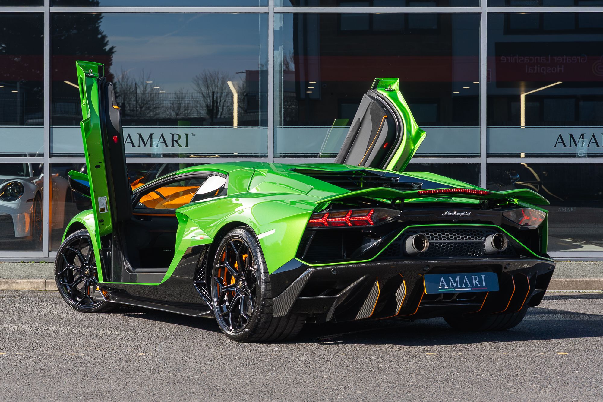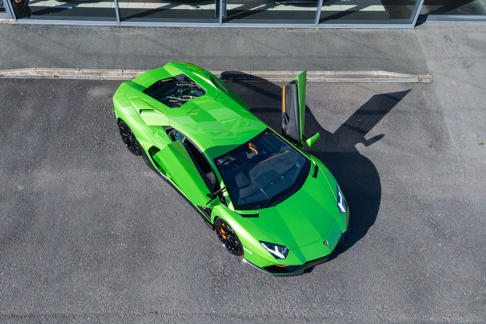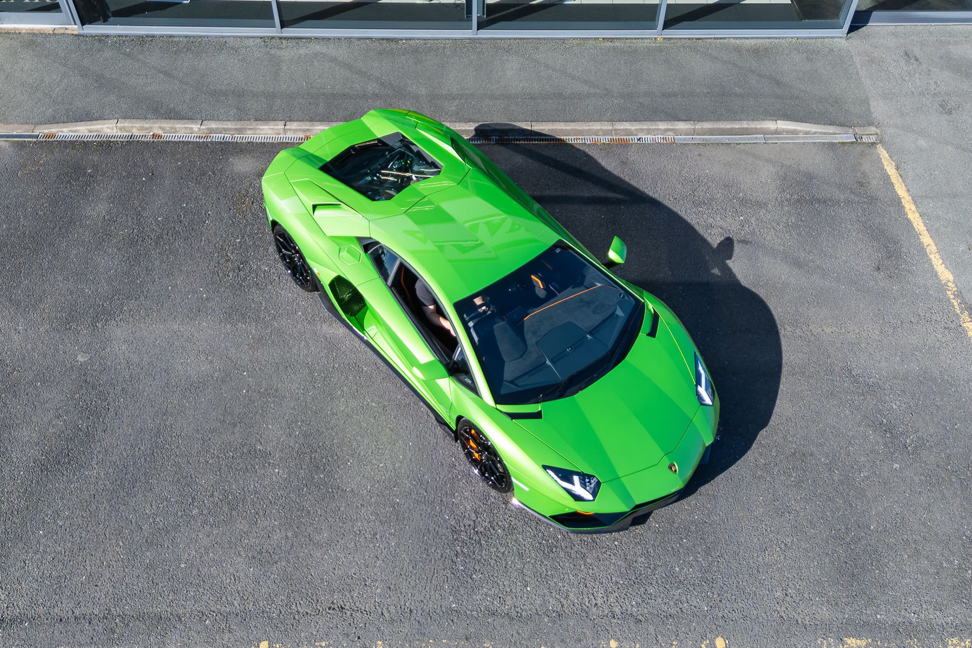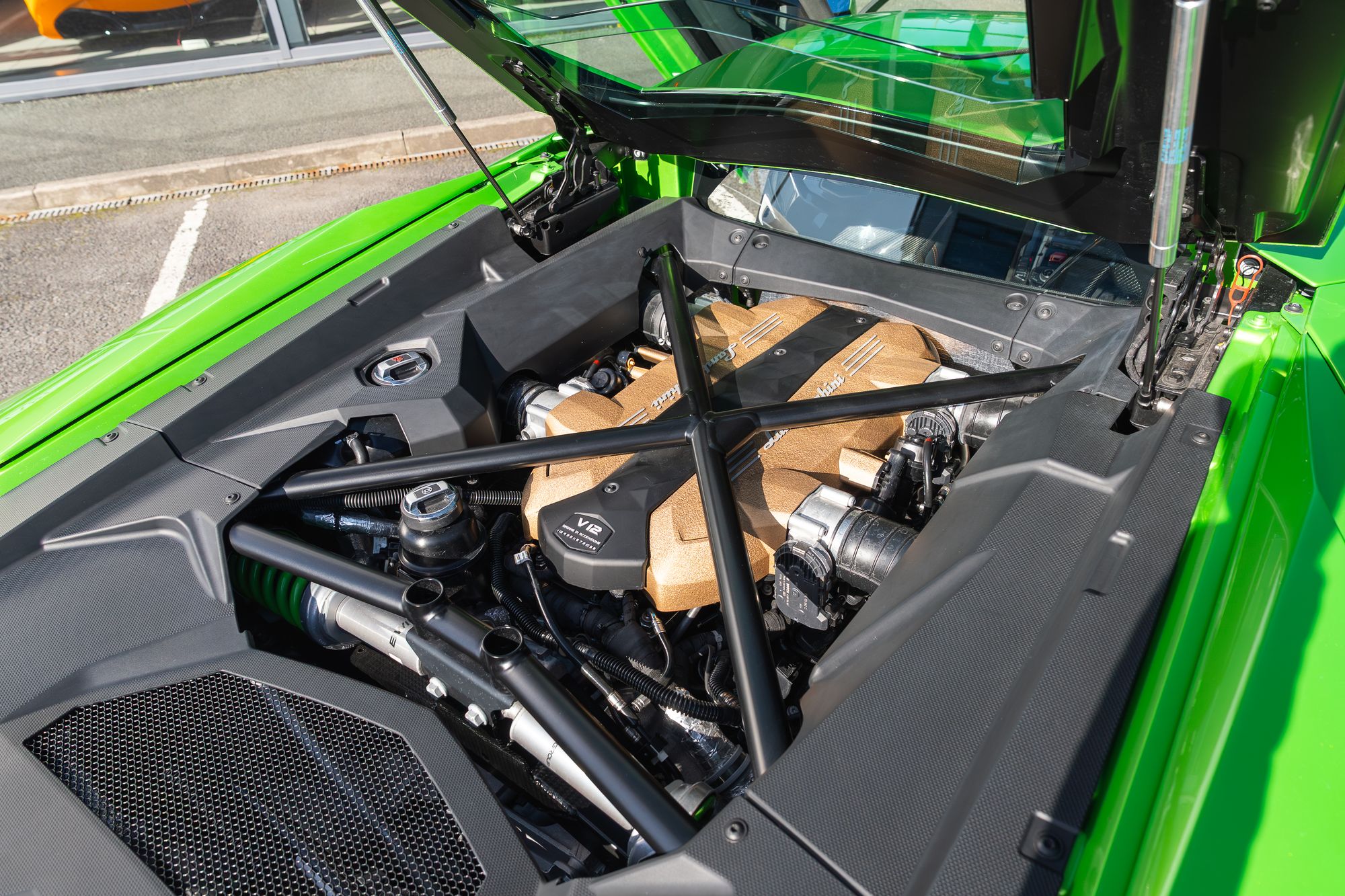 The exterior presents with commanding presence, highlighted by orange brake calipers and the transparent engine bonnet that proudly displays the iconic V12 powerplant. Lamborghini Dynamic Steering and green suspension springs further emphasise the car’s performance-focused engineering.