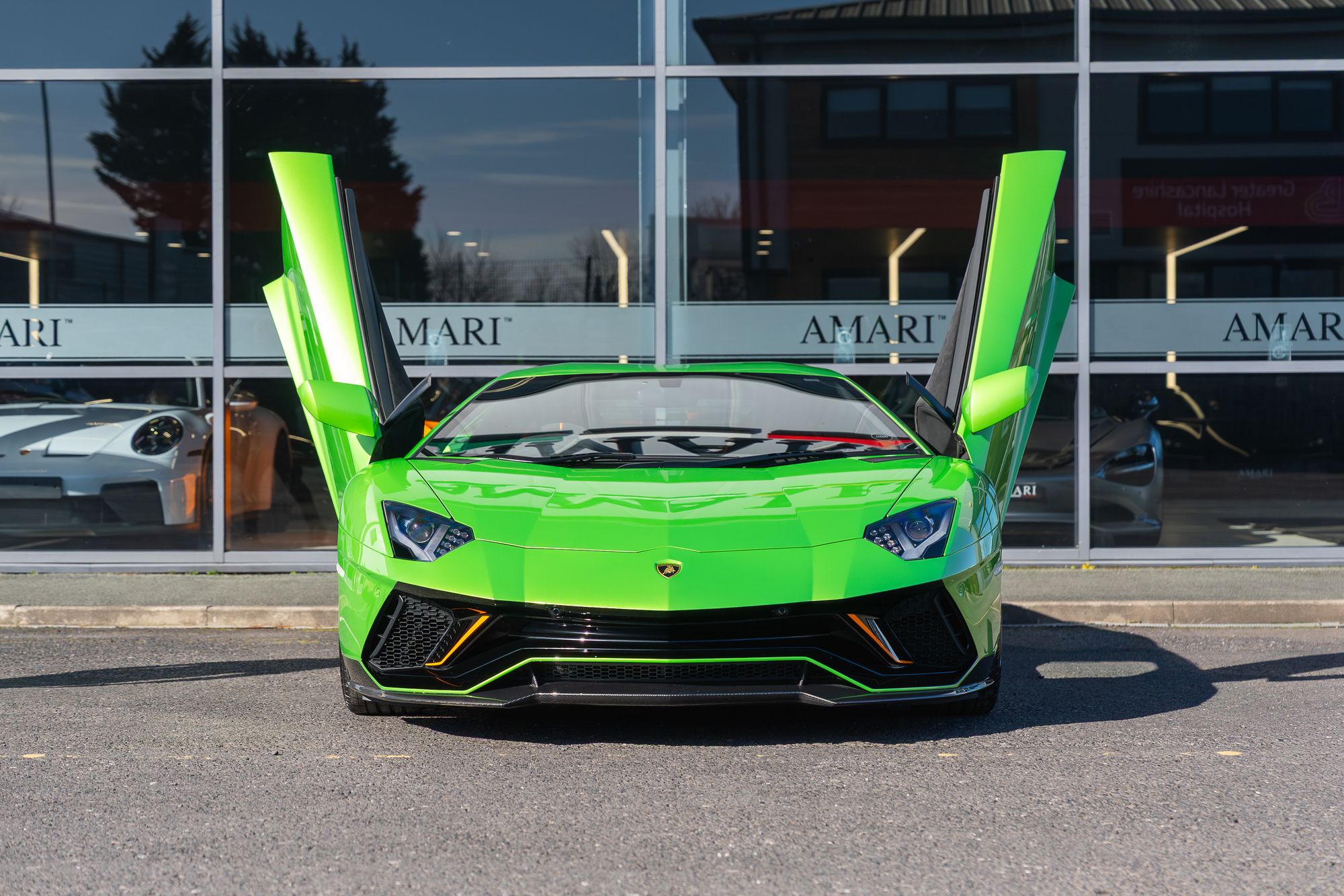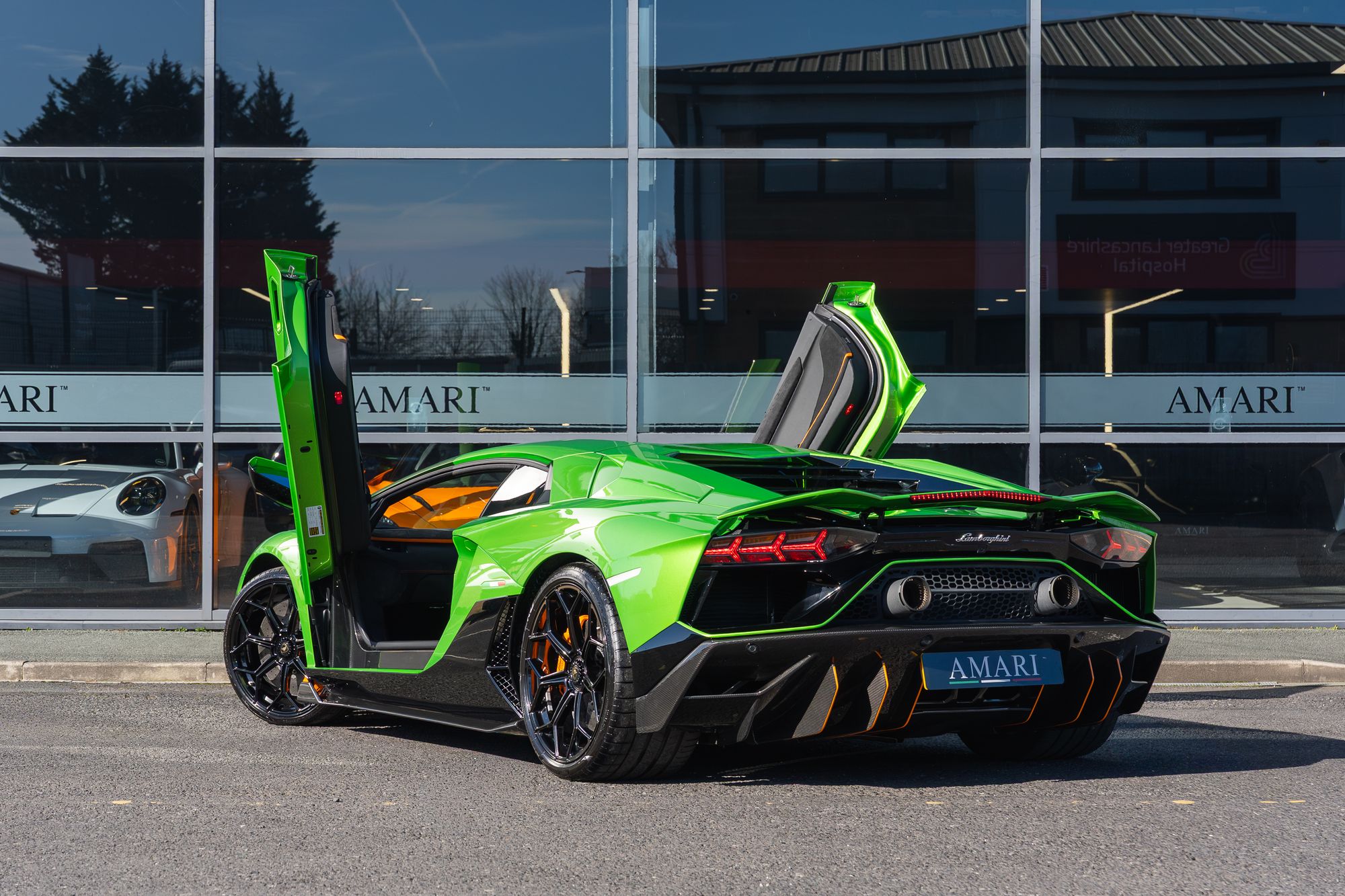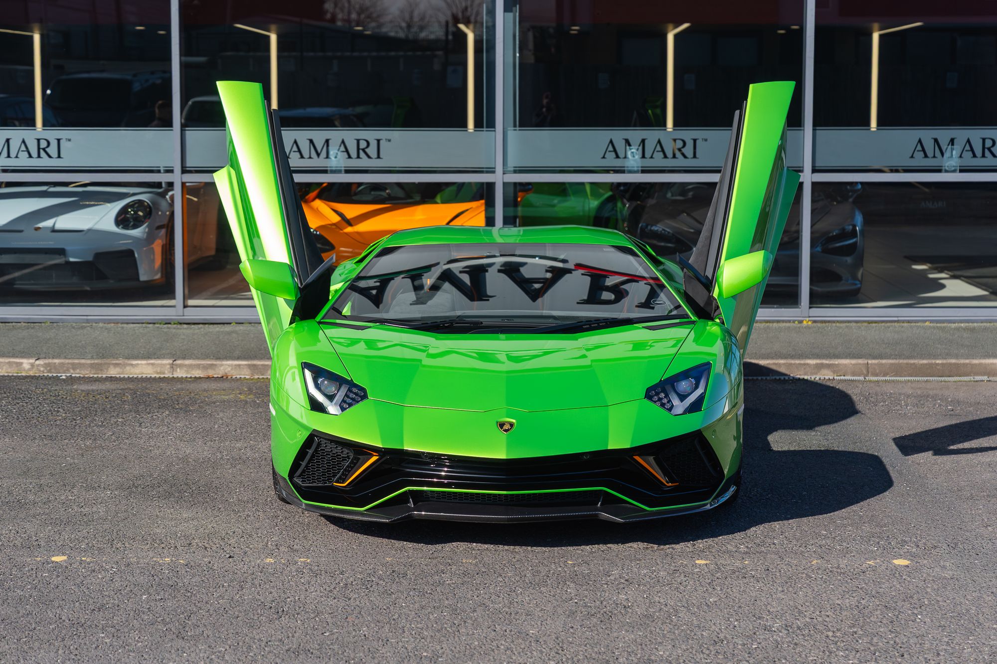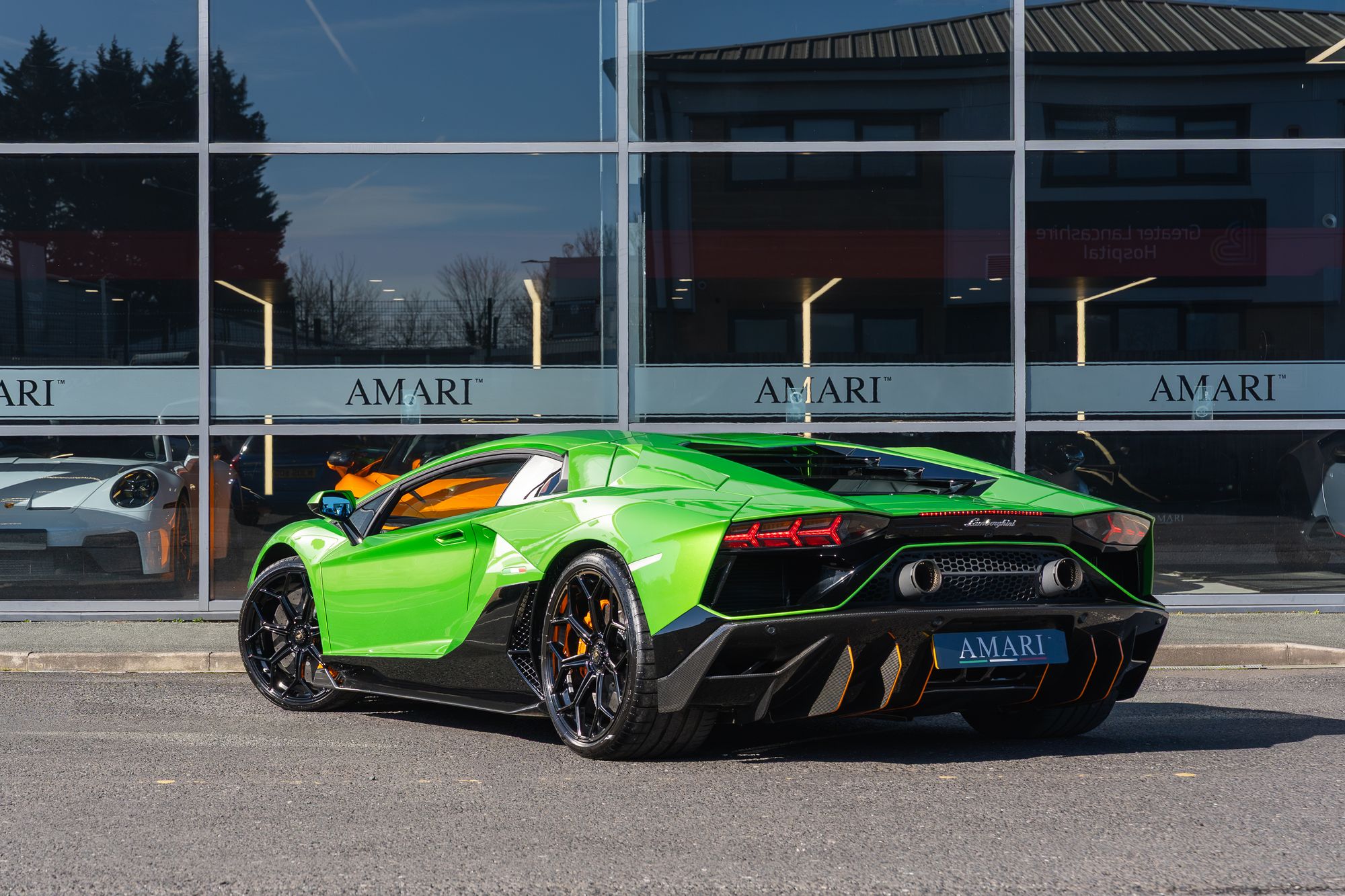 The exterior presents with commanding presence, highlighted by orange brake calipers and the transparent engine bonnet that proudly displays the iconic V12 powerplant. Lamborghini Dynamic Steering and green suspension springs further emphasise the car’s performance-focused engineering.