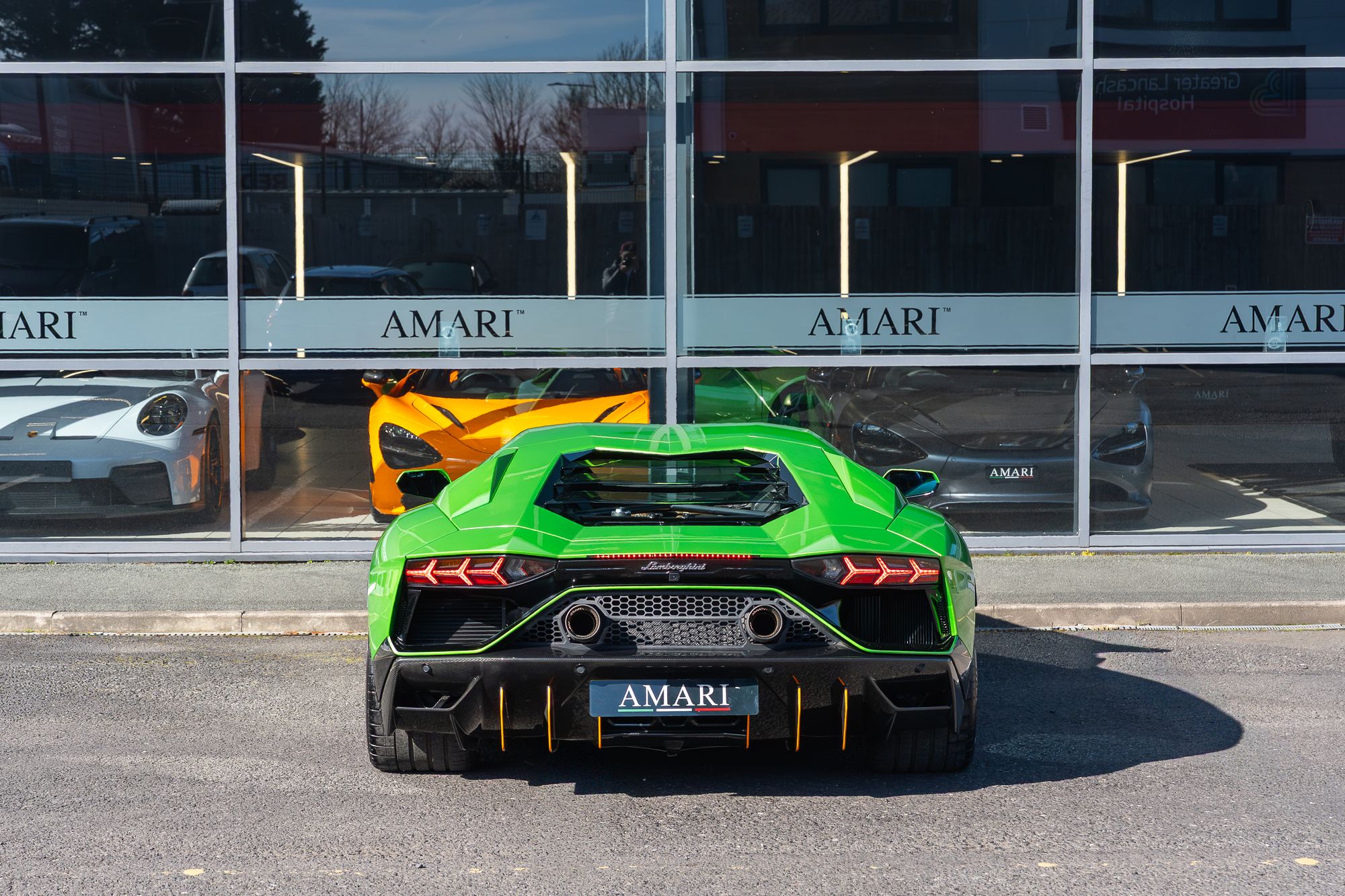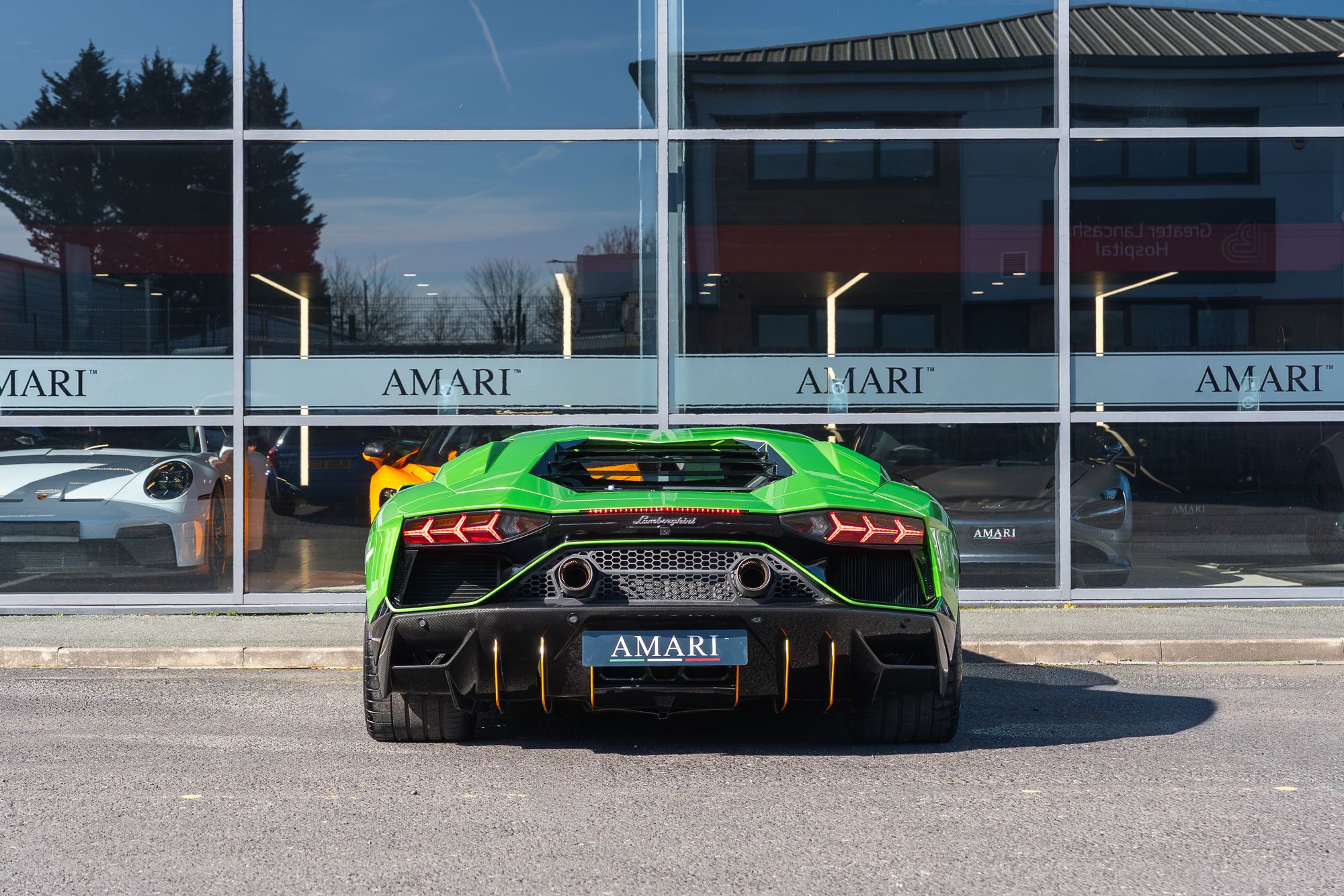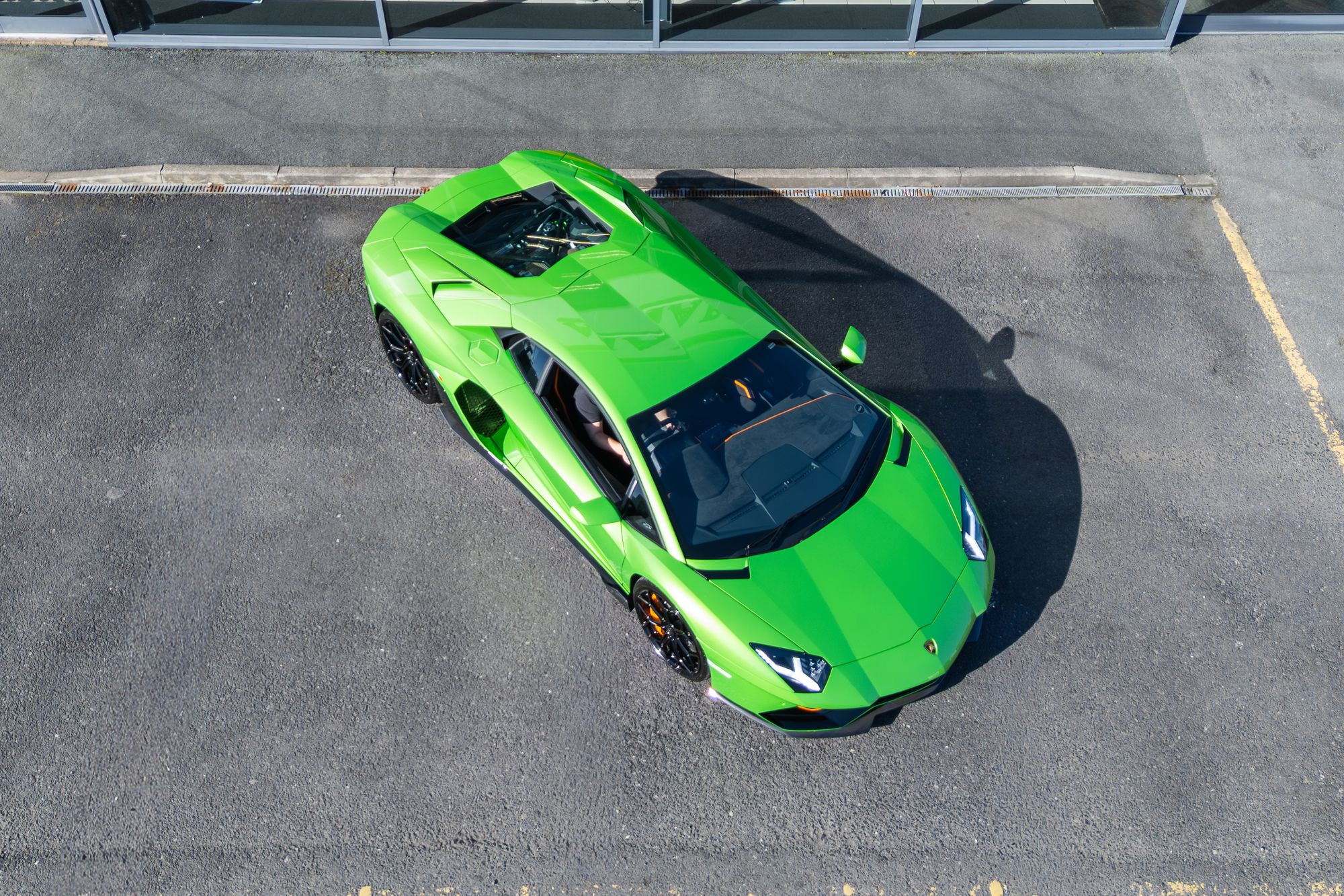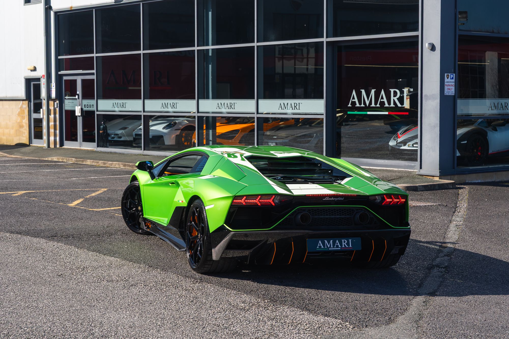 The exterior presents with commanding presence, highlighted by orange brake calipers and the transparent engine bonnet that proudly displays the iconic V12 powerplant. Lamborghini Dynamic Steering and green suspension springs further emphasise the car’s performance-focused engineering.