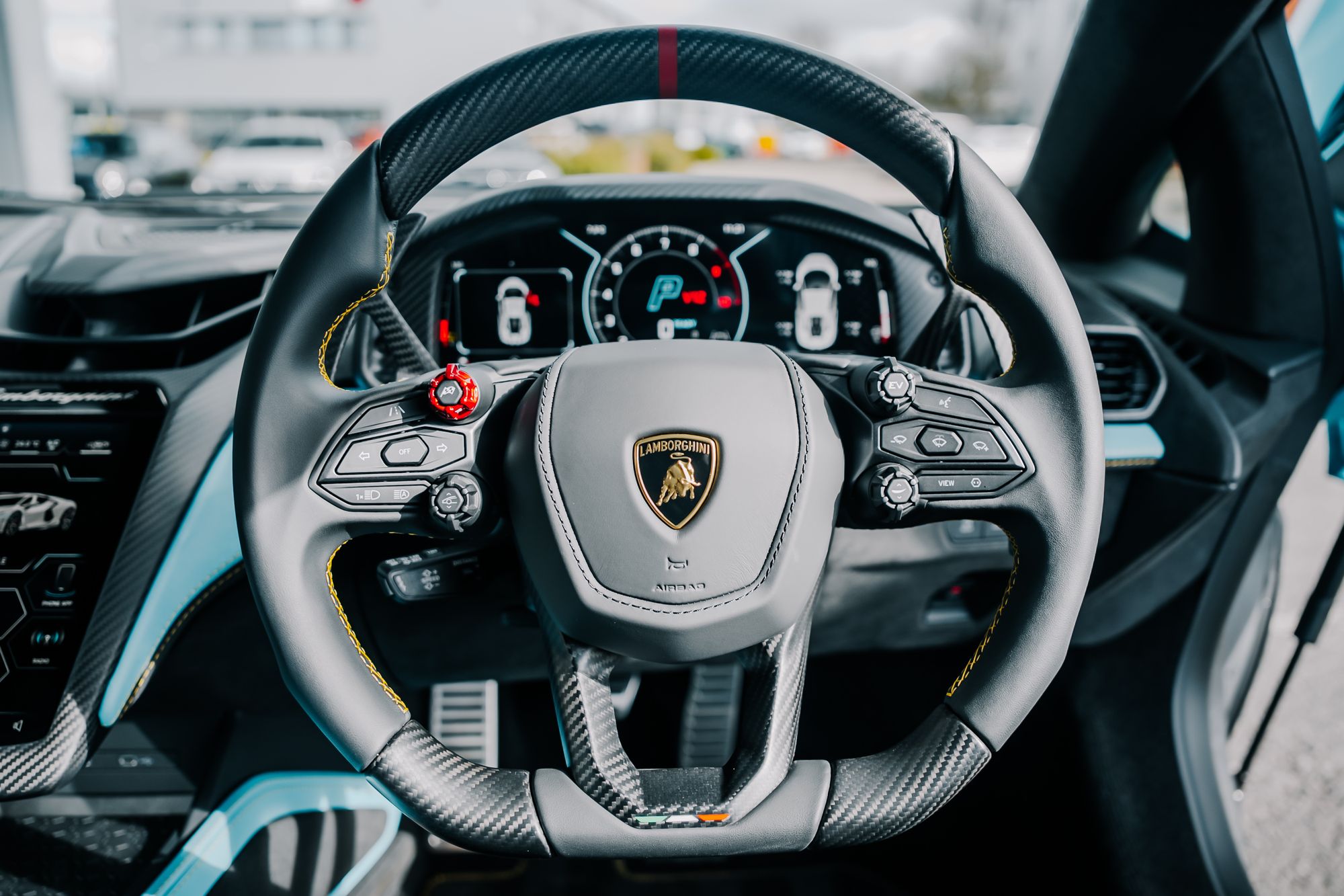 The cabin features extensive Ad Personam personalisation, including Ad Personam Sports Seats, custom door panels, central armrest, lower dashboard, tunnel and console. Additional highlights include the Sportiva Trim Ad Personam, Q-Citura on the roof and door panels, inverted stitching, and floor mats with leather piping and double stitching, all complemented by the refined Style Package in High Gloss Black. Comfort is enhanced with full electrically adjustable and heated seats, complete with the embroidered Lamborghini shield on each headrest.