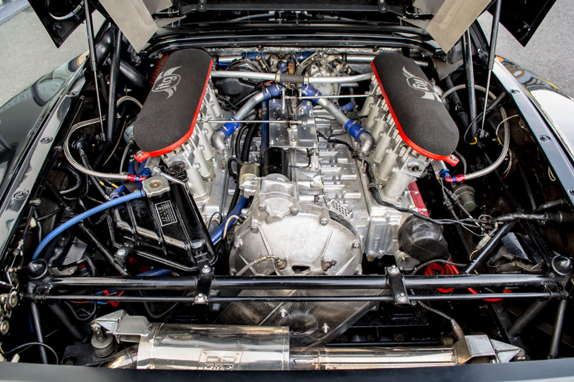The flat 12 engine has been highly modified and now has huge throttle bodies sat on top, the exhaust snorts and pops and sounds like a 60's Le Man's car.