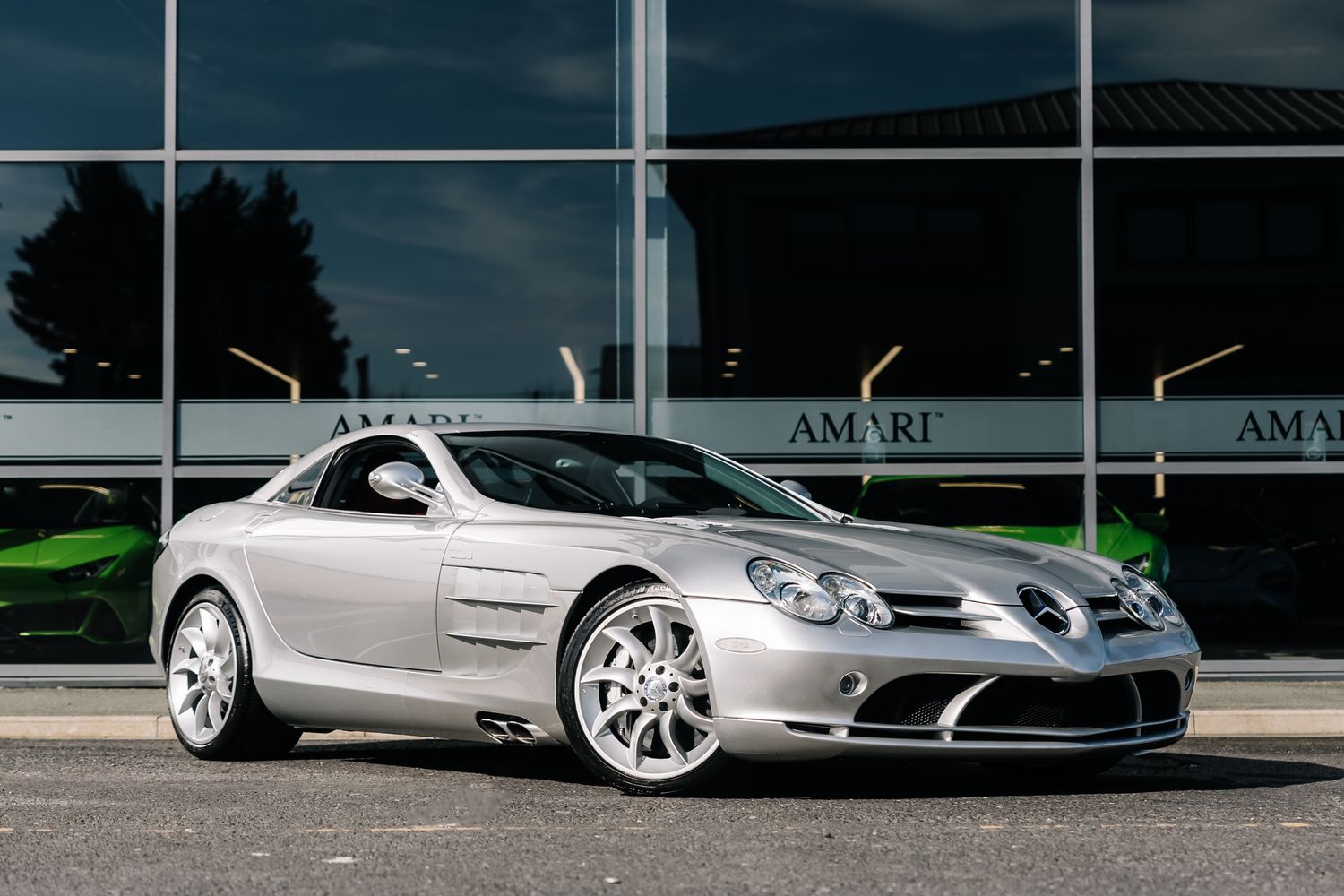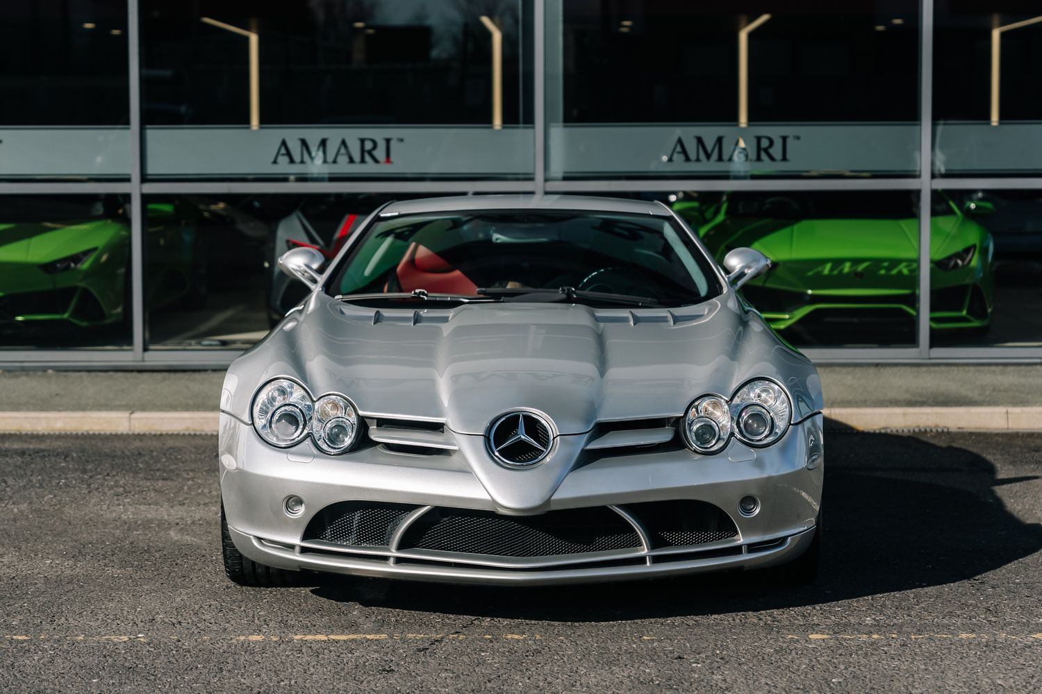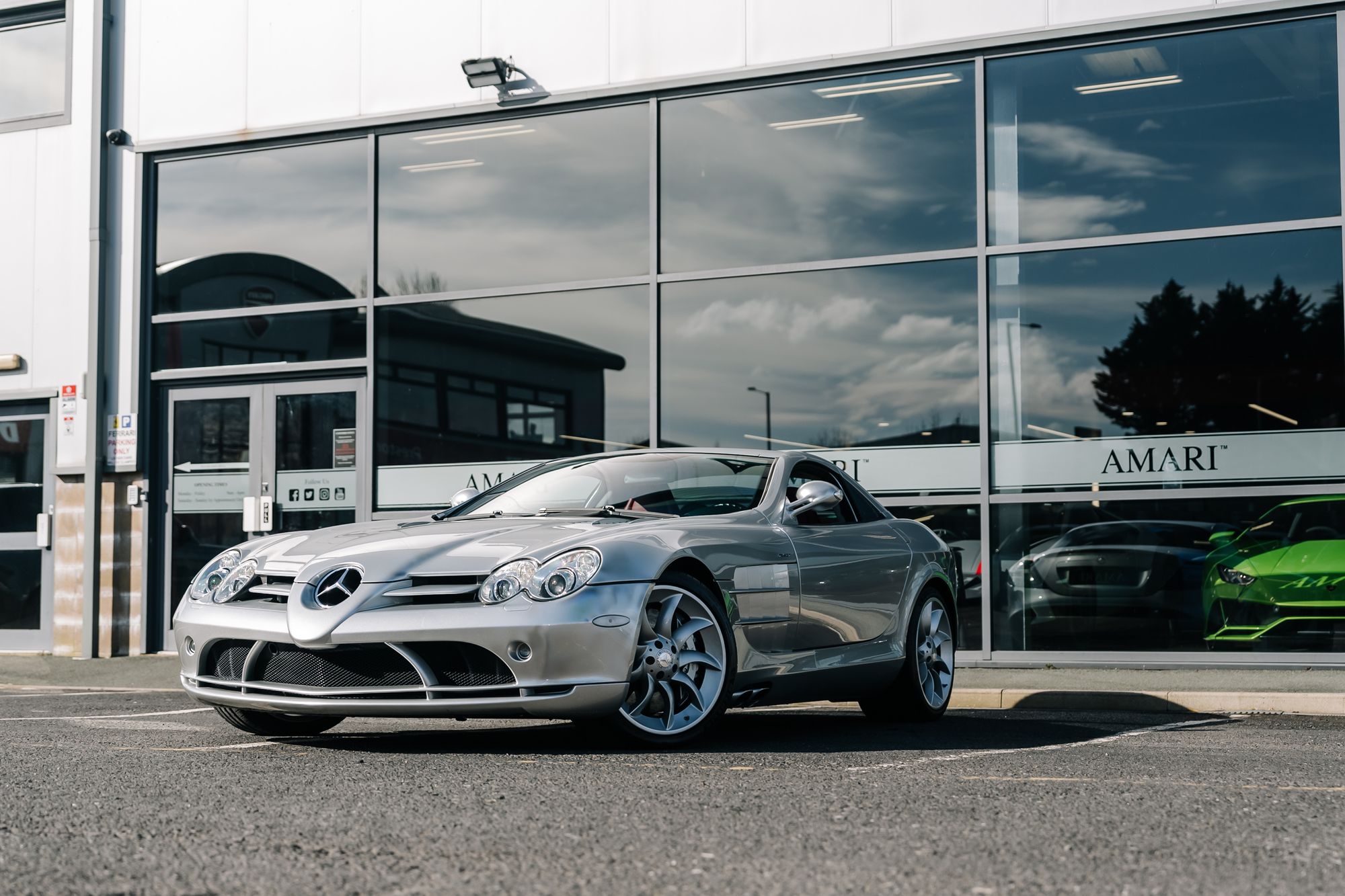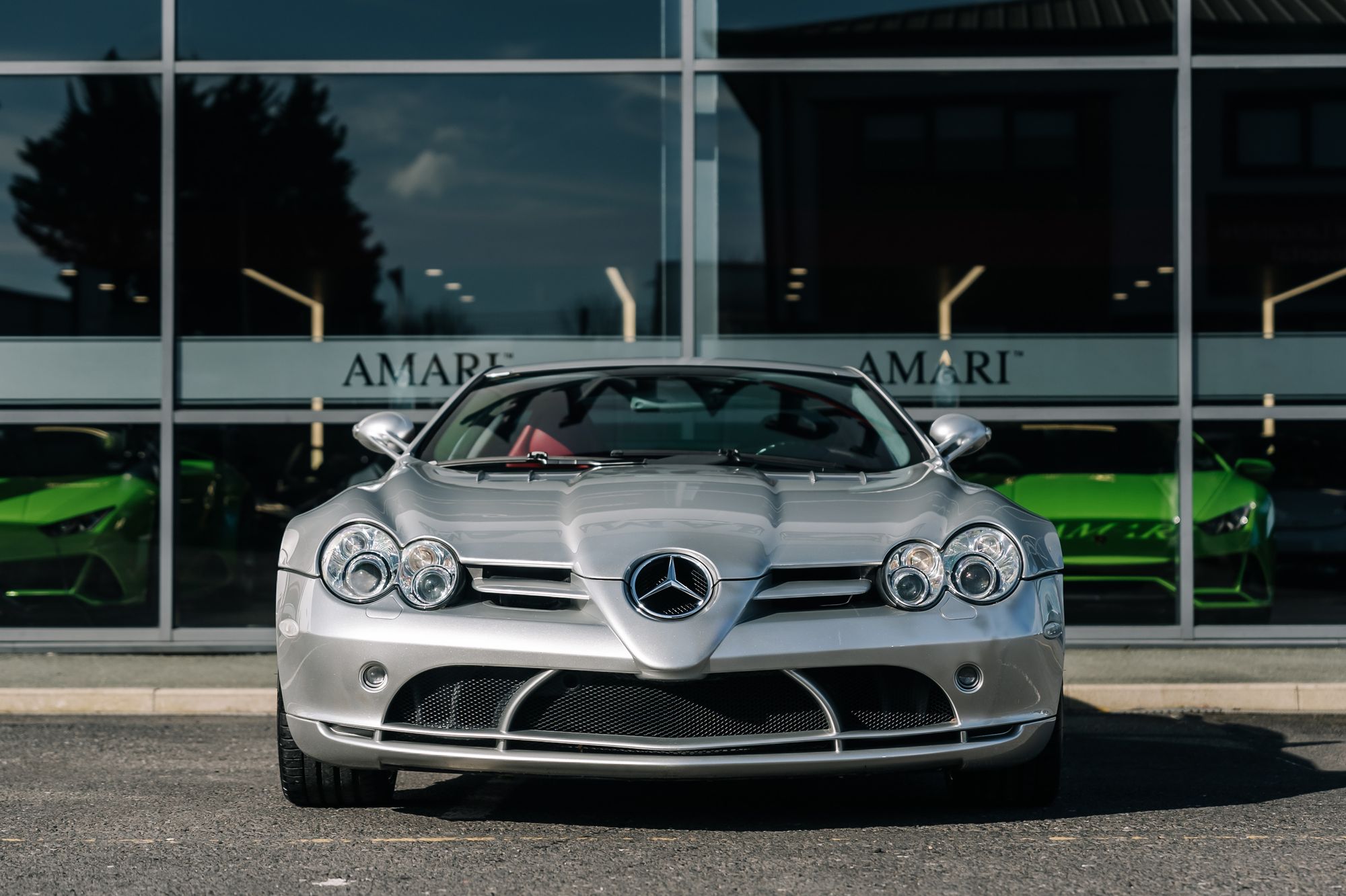 For sale is an exquisite Mercedes-Benz SLR McLaren, a true masterpiece manufactured in December 2004 and registered in the UK in July 2015. Adorning the striking Crystal Laurite Silver exterior, this left-hand drive beauty exudes elegance. The interior boasts Red Premium Leather, providing a luxurious and sporty ambiance. The Turbine Sportwheels complement the sleek design, while the distinctive Gullwing Doors add a touch of automotive sophistication.