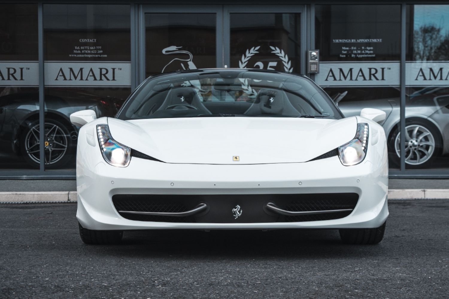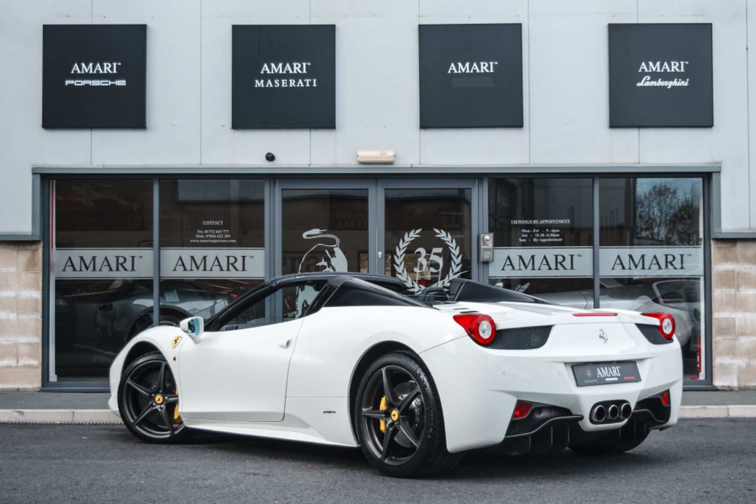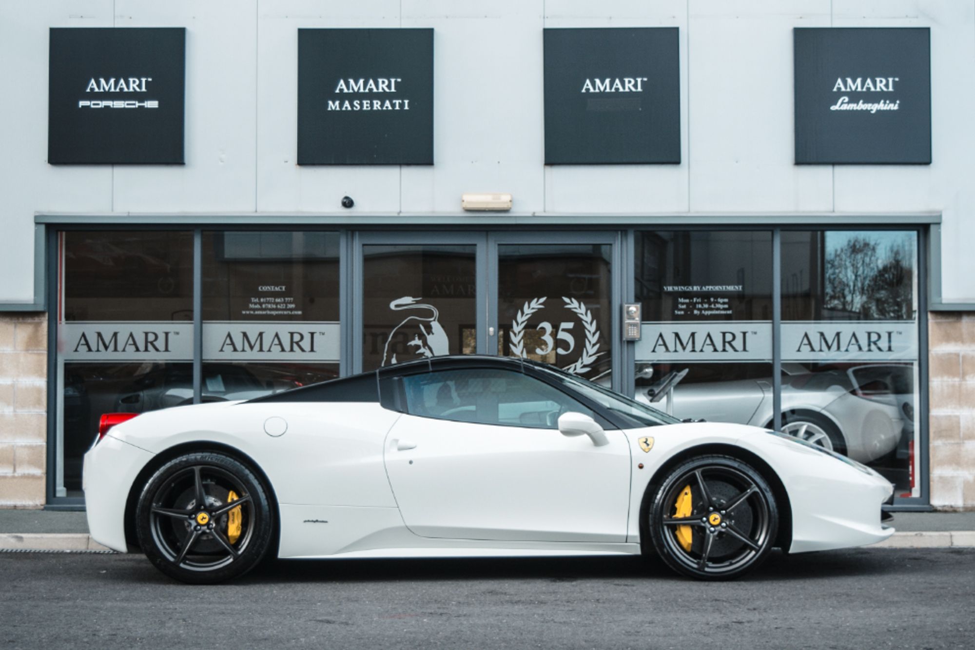 This particular example is finished in Bianco Avus, 20" Forged Alloys painted in Nero, yellow callipers and all important Scuderia Shields provide a contrast to these black alloys. The roof has also been wrapped in gloss black, this can be removed prior to sale if required. On the interior Carbon Fibre Racing Seats and trimmed in beautiful Nero Leather with Bianco stitching. From these fantastic seats the driver is faced with Ferrari's beautiful F1 derived Carbon Fibre steering wheel with LED shift lights. Both the interior and exterior are presented in an as new condition. The full spec of this fantastic car is outlined below: