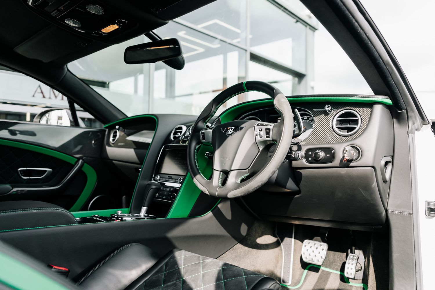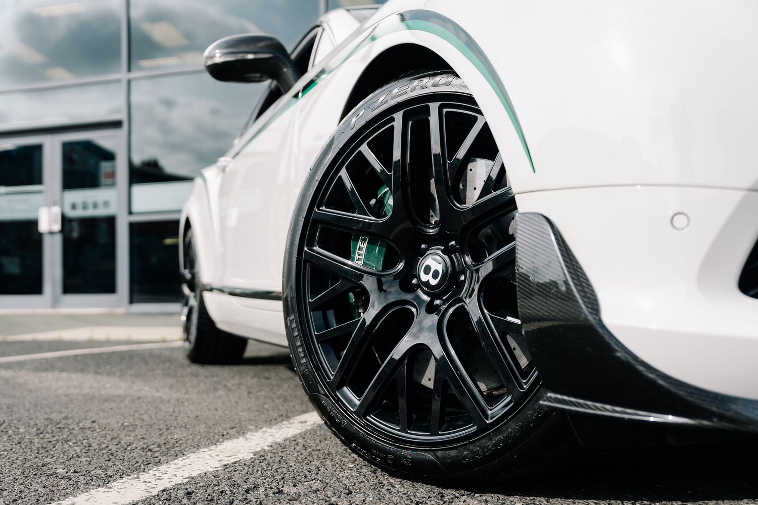 Inside, the GT3-R boasts a luxurious yet sporty cabin with Diamond Quilted Hide Seats and Doors, along with a GT3-R Sports Gear Lever. The Bentley Emblems Stitched in Green and Contrast Stitching in Green add a touch of elegance, while high-tech features like Bentley GPS Tracking, Keyless Entry, and a Reversing Camera enhance convenience and security.