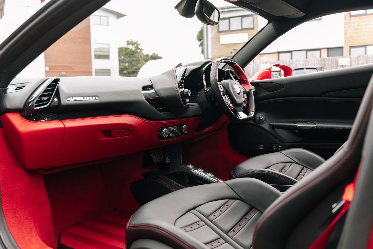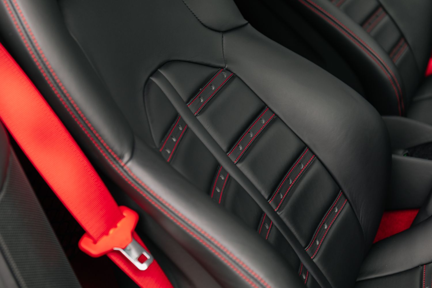 This particular example is presented in Rosso Corsa with Nero Hide interior, featuring contrasting Rosso stitching. This vehicle is fitted with premium features, including 20" Forged Diamond Alloy Wheels, extensive carbon fibre details, Daytona-style seats, and a sport exhaust system. It has a low mileage of 3,908 Miles, covered by three owners, and comes with a full Ferrari service history.
