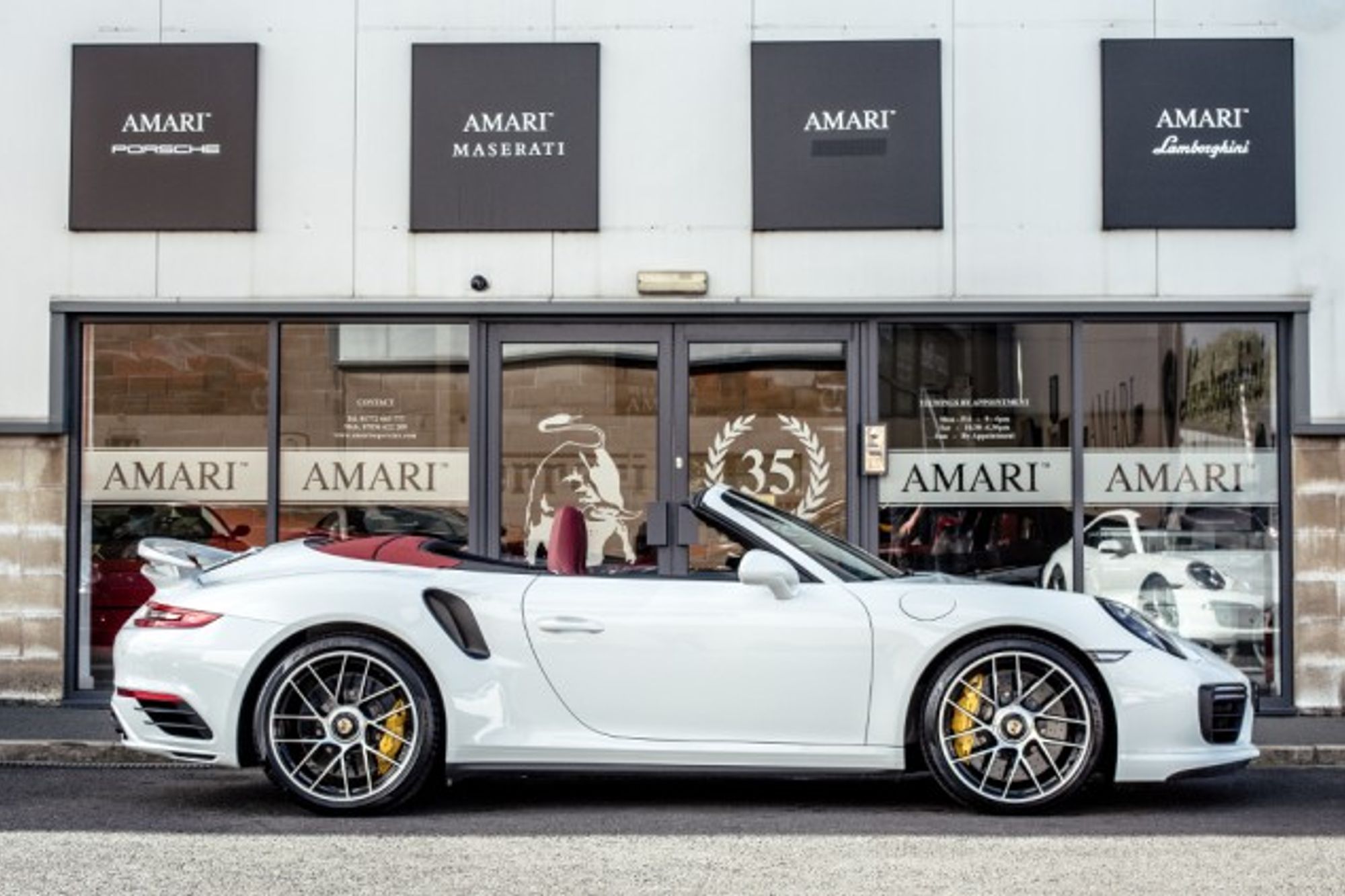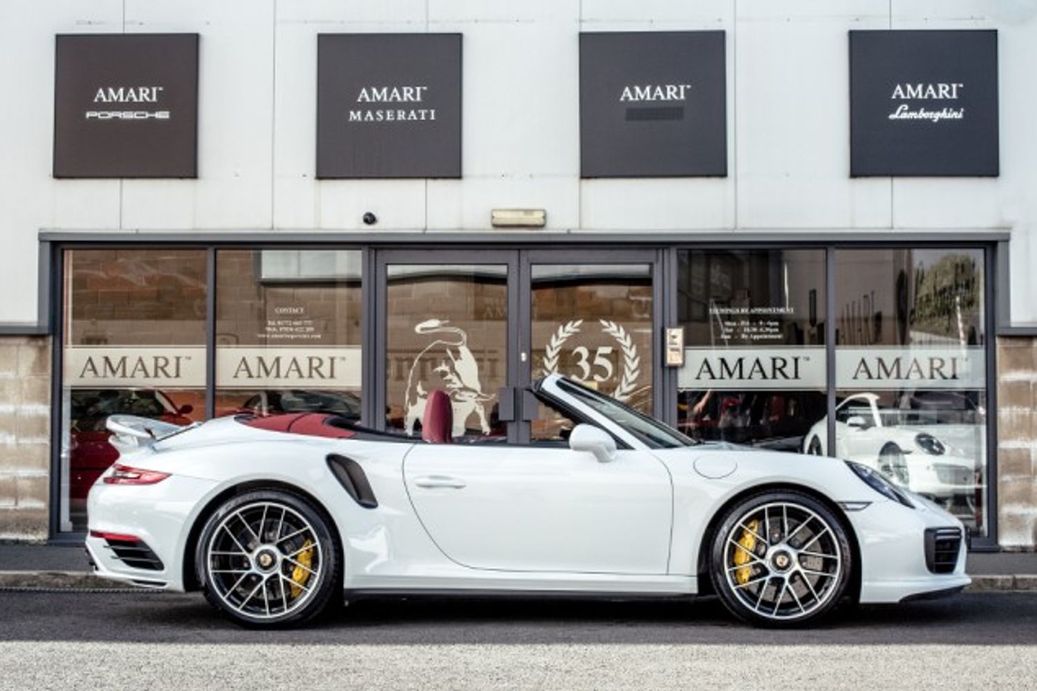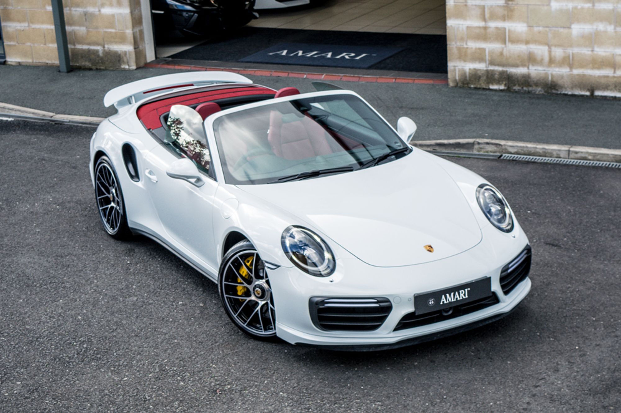 AMARI is delighted to offer you this stunning example 2016 / 66 Registered Porsche 911 Turbo S Cabriolet (Generation 2) in Carrera White Metallic, with Red Leather Interior, having covered only 14,007 Miles by 2 Owners from New.