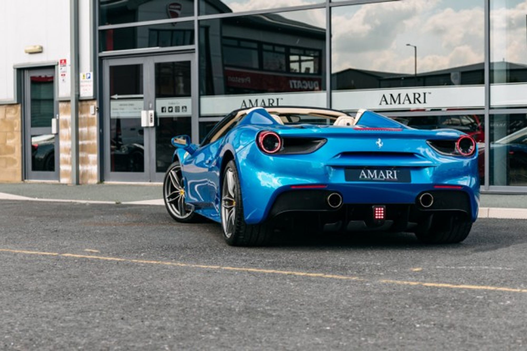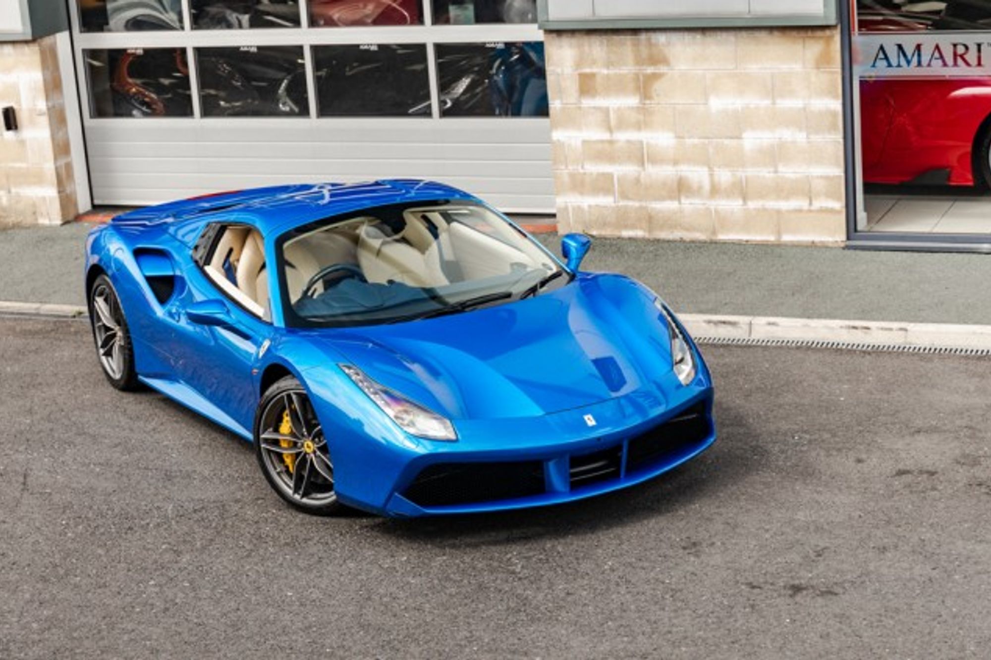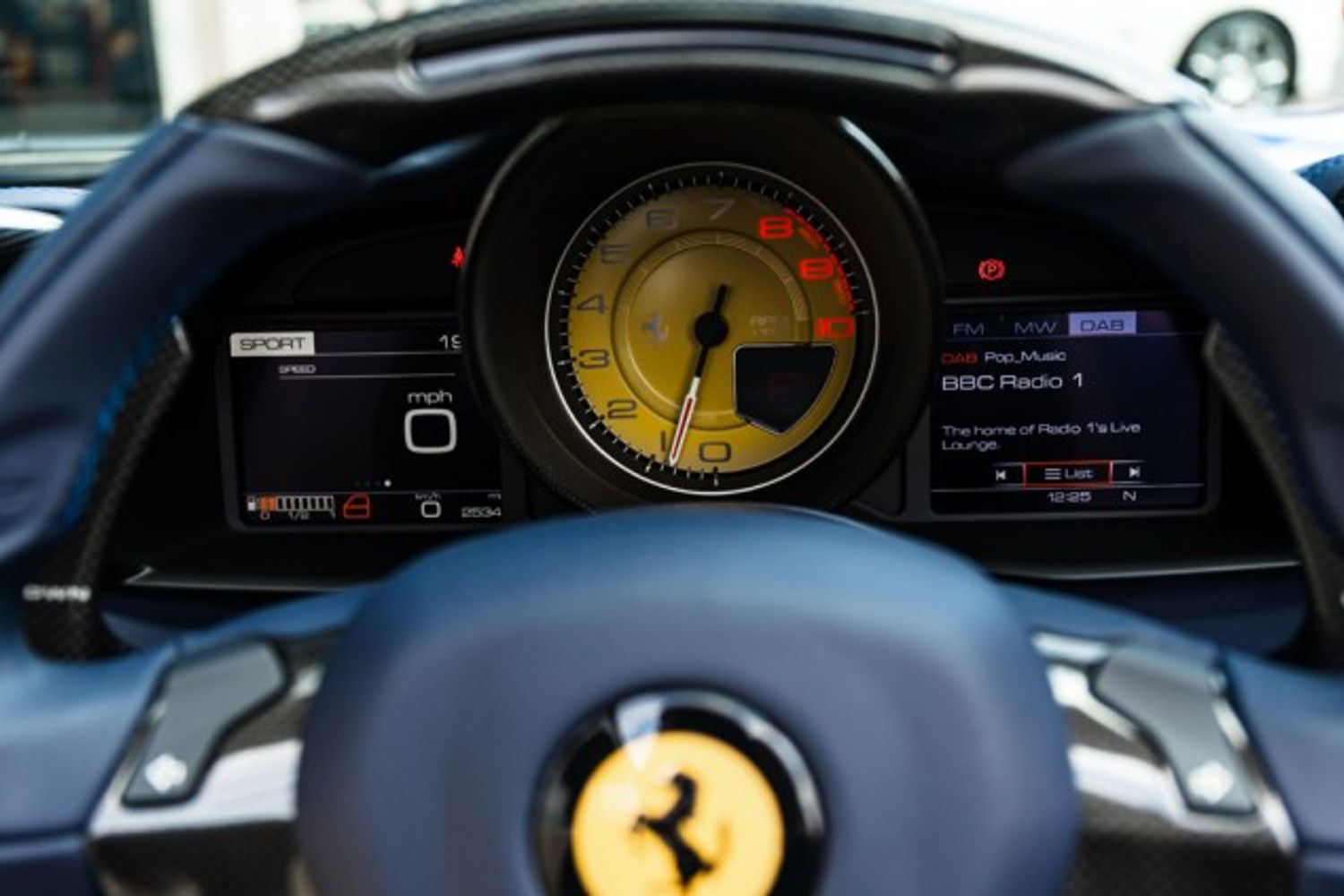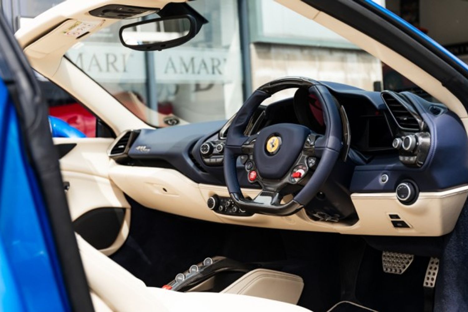 This particular, imposing example of the Ferrari 488 Spyder was supplied new in September 2017 (67 Registered). Finished in the gleaming Extra Range Exterior Paint, Blu Corsa featuring vibrant Giallo Brake Calipers, this truly is a stunning colour for the 488 Spyder. The interior is upholstered in a contrasting Crema Hide with Coloured Stitching in Blu also Blu Floor Mats. This vehicle has covered a mere 2,534 Miles by 1 Owner from New. The extensive specification is outlined below: