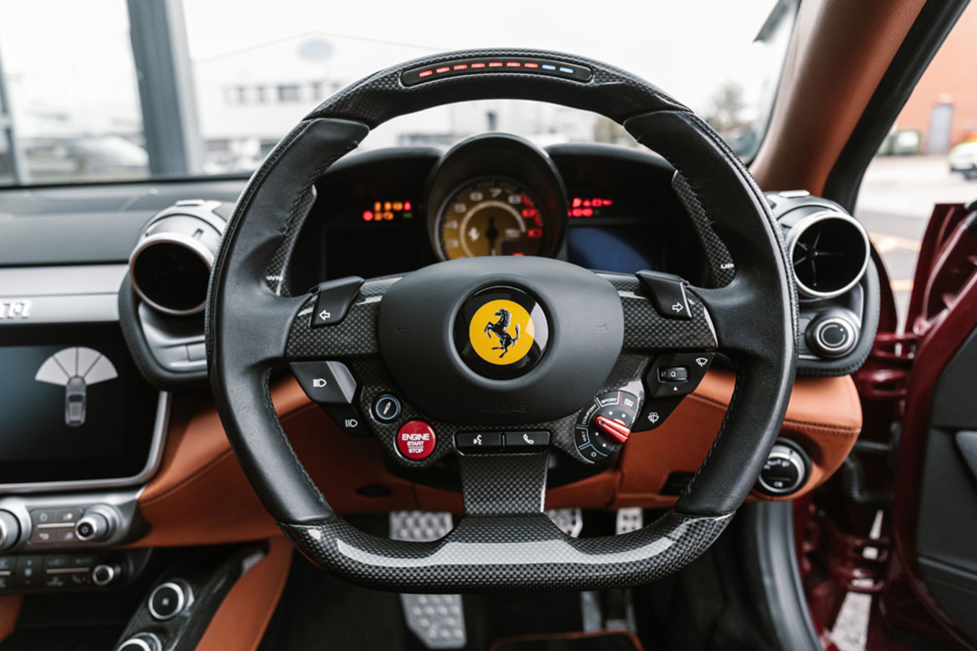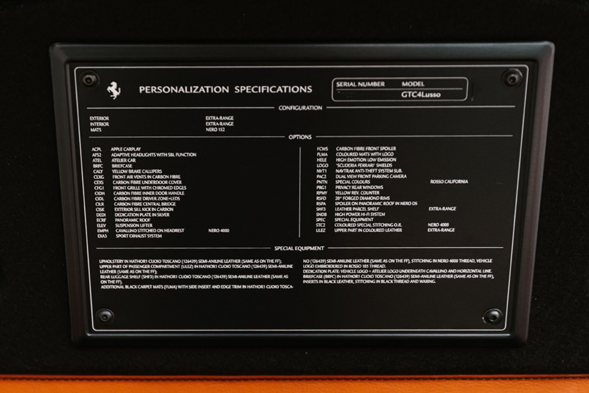 This particular example of the Ferrari GTC4Lusso was supplied new to the UK in March 2018, 18 Registered. This vehicle is presented to you in a truly unique colour combination. The exterior is finished in in the Extra Range exterior paint, Rosso California. The interior is upholstered in an Extra Range colour, Cuoio Toscano Semi-Aniline Leather (Same as on the FF). This has covered a mere 9,685 Miles by 1 Owner from New. The already extensive specification of the Ferrari GTC4Lusso is enhanced by the following options: