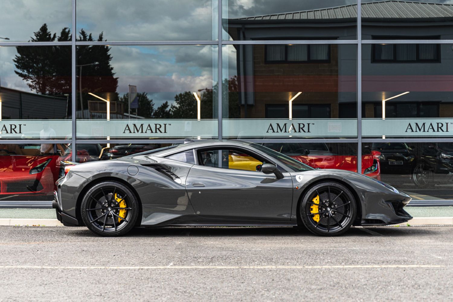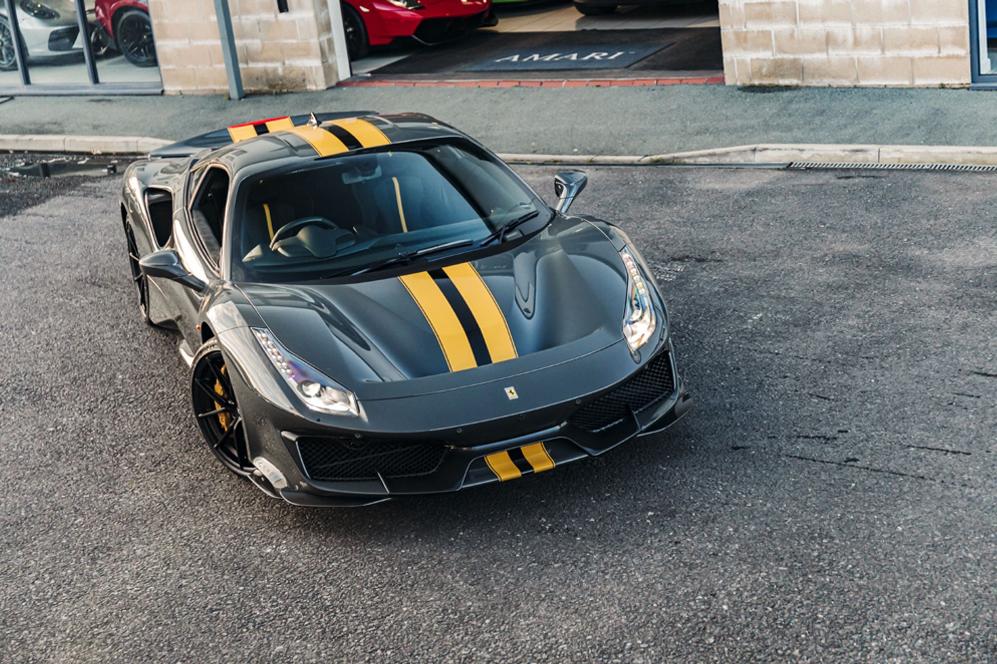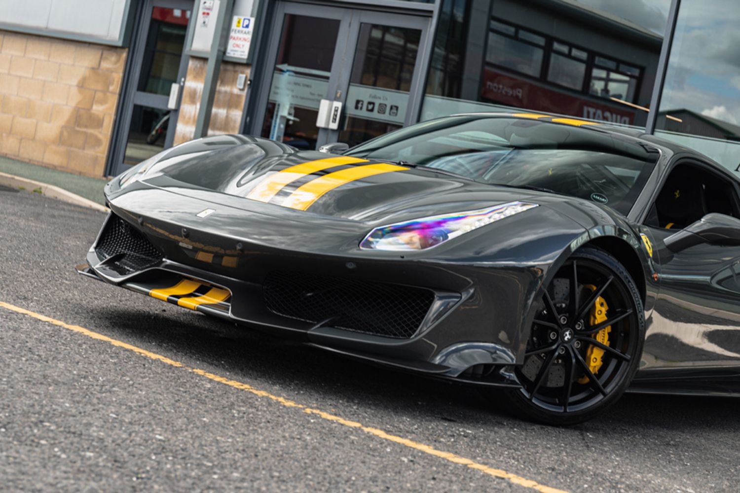 This particular example of the Ferrari 488 Pista (Atelier Car), was Registered in June 2019 (19 Plate). Finished in the Ferrari Historical Colour, Grigio Scuro, the Racing Stripe is in Glossy Giallo Modena, also featuring an extensive amount of Carbon Fibre. The interior is upholstered in Alcantara Nero blending perfectly with the subtle exterior. This vehicle has covered a mere 1,500 Miles by 2 Owners from New. The extensive specification is outlined below: