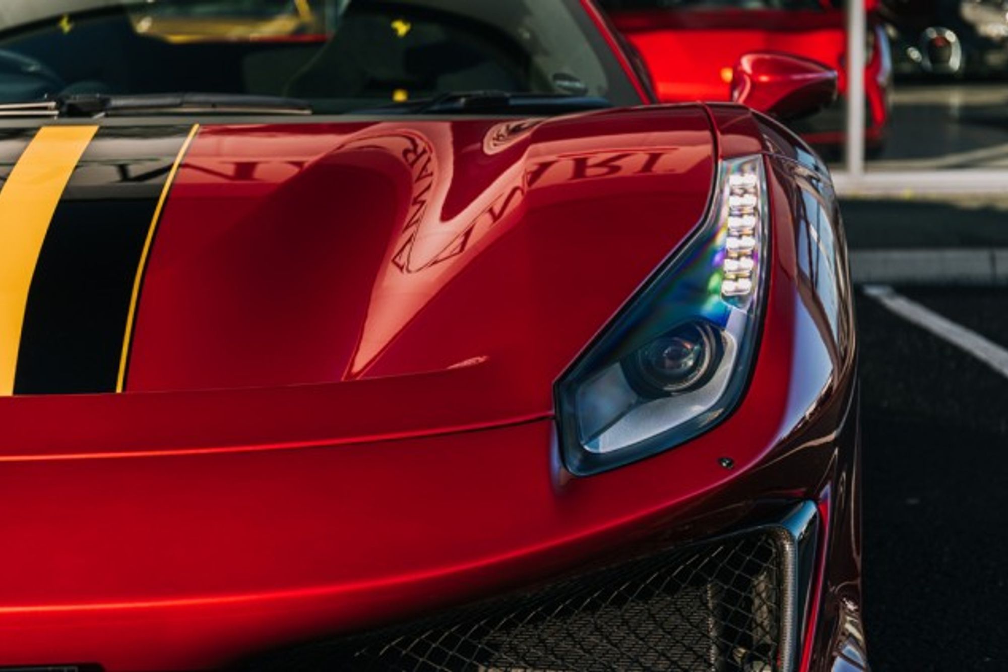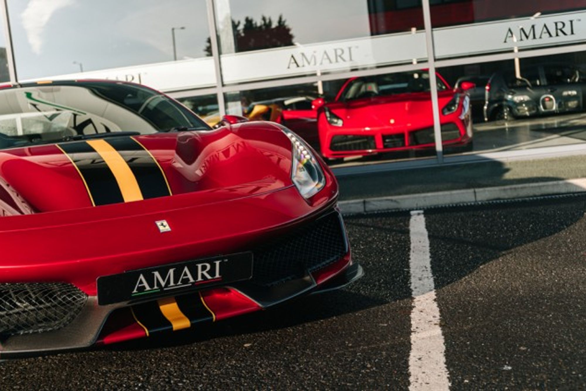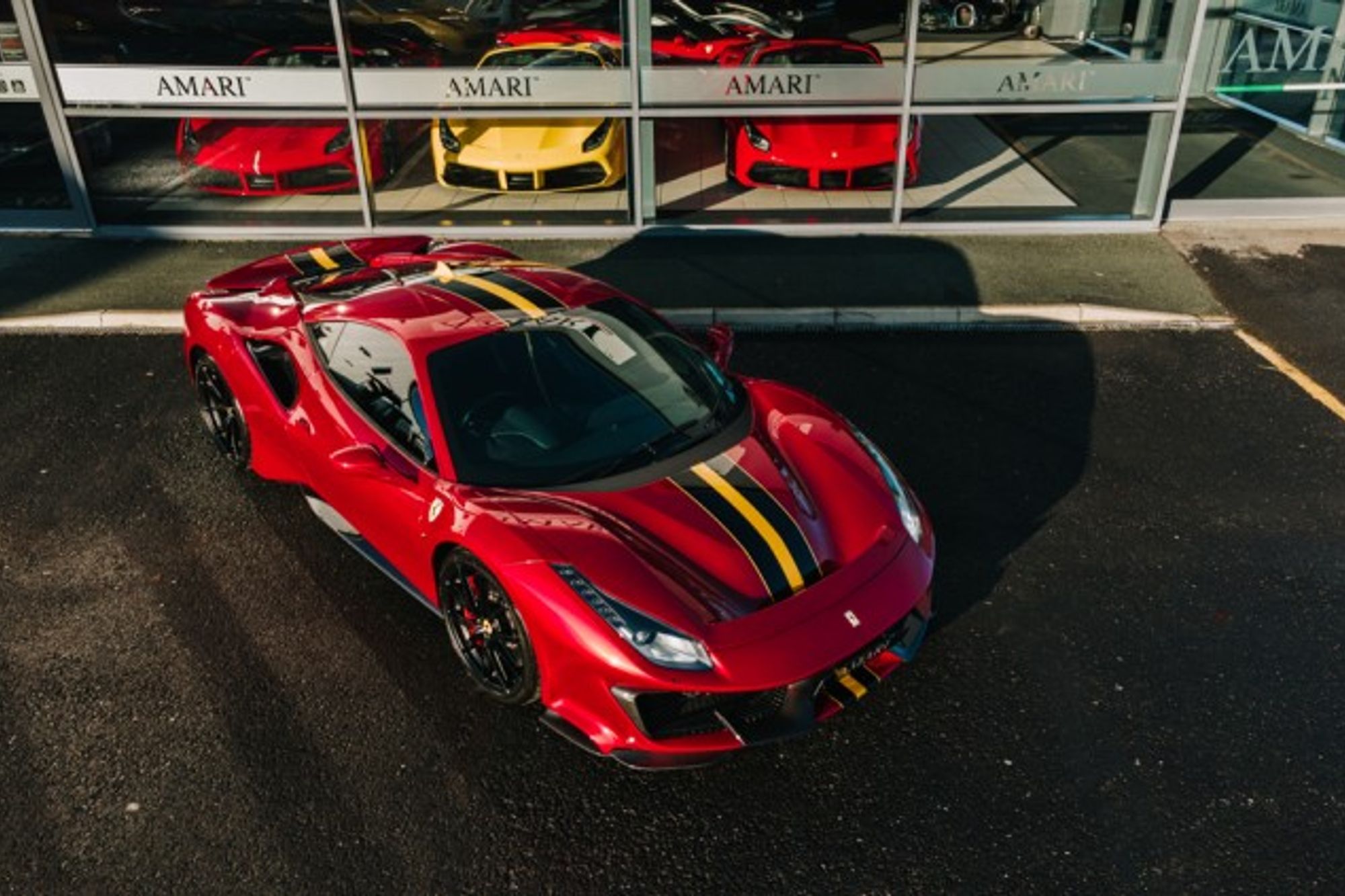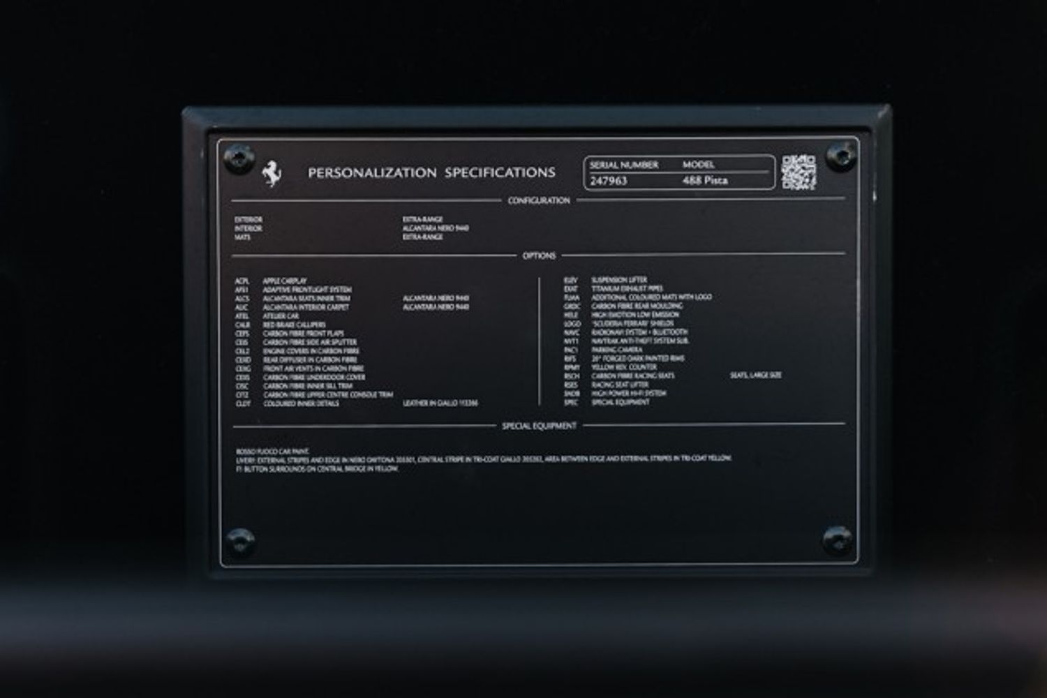 This particular example of the Ferrari 488 Pista was supplied new to the UK in September 2019, 69 Registered. The car was specced at the Atelier in Maranello. Finished in the unique, special order Rosso Fuoco with the Racing Stripe in Nero Daytona and Giallo, featuring extensive Carbon Fibre optional extras with 20" Forged Dark Paint Alloy Wheels. The interior is upholstered in Nero Alcantara with contrasting Giallo inner details. This vehicle has covered 2,646 Miles by 1 Owner from new. The already huge specification is the Ferrari 488 Pista is vastly enhanced by the following options, outlined below: