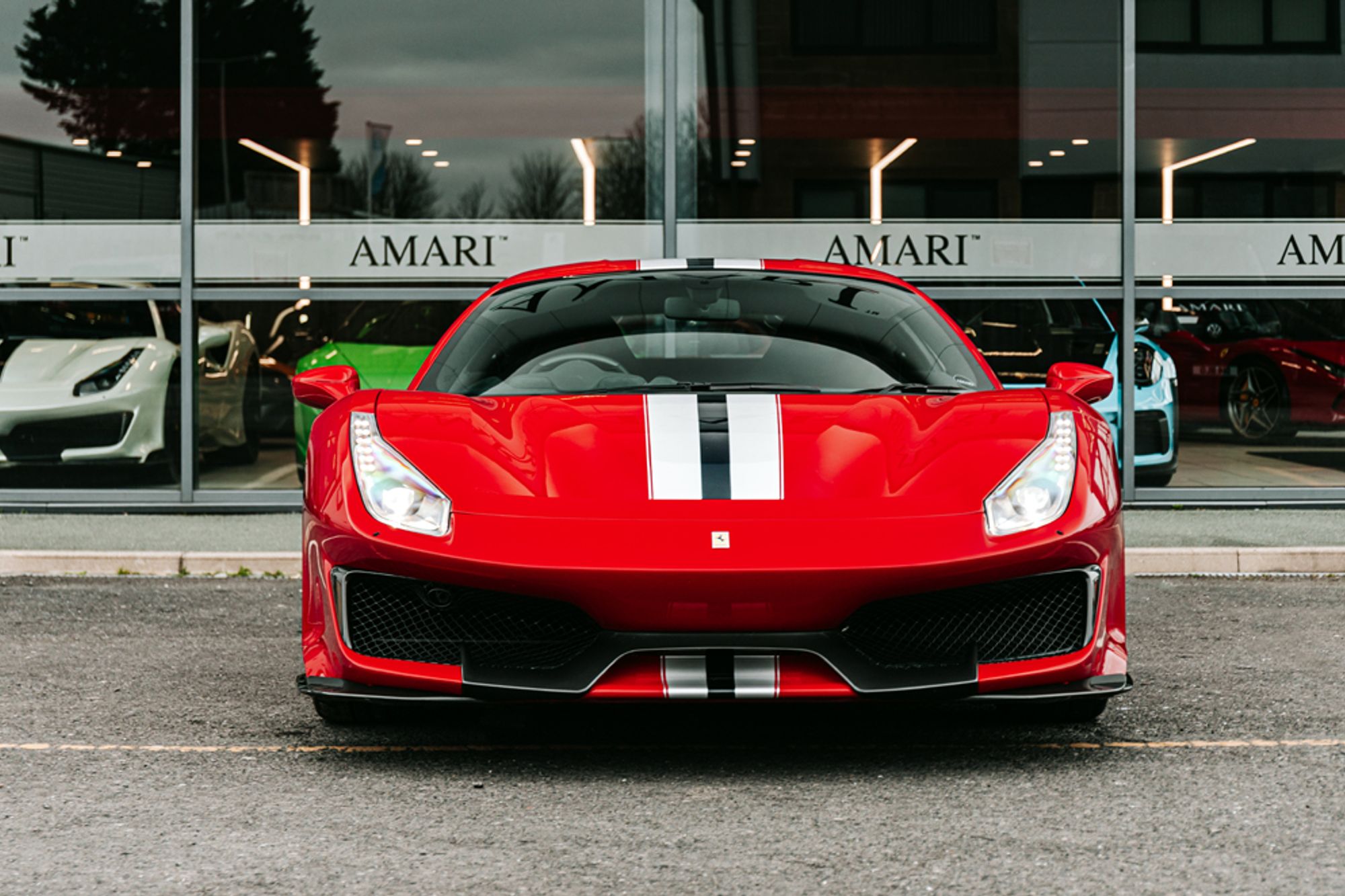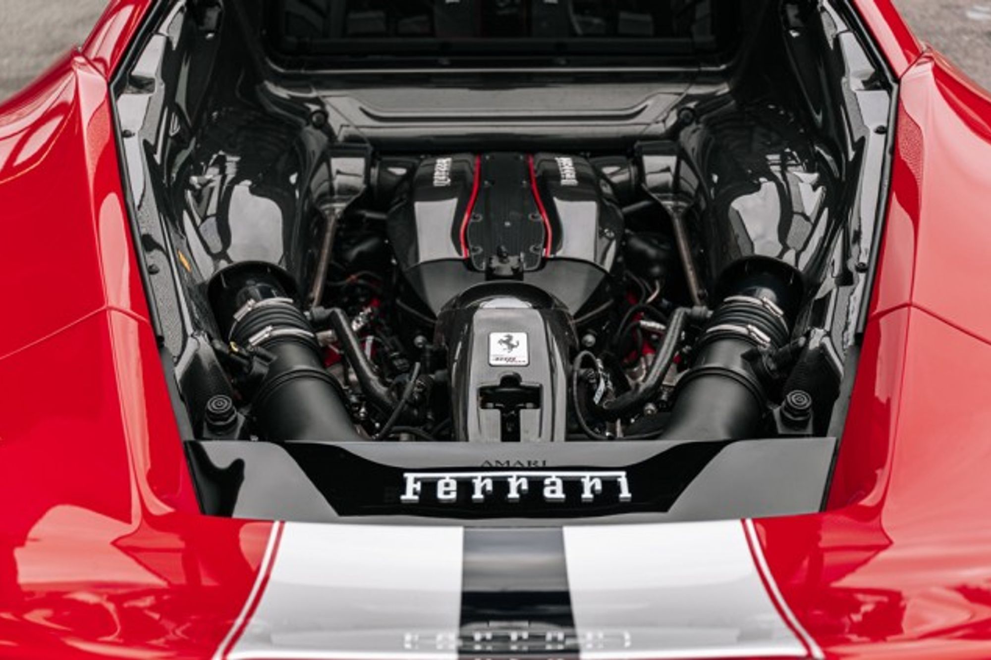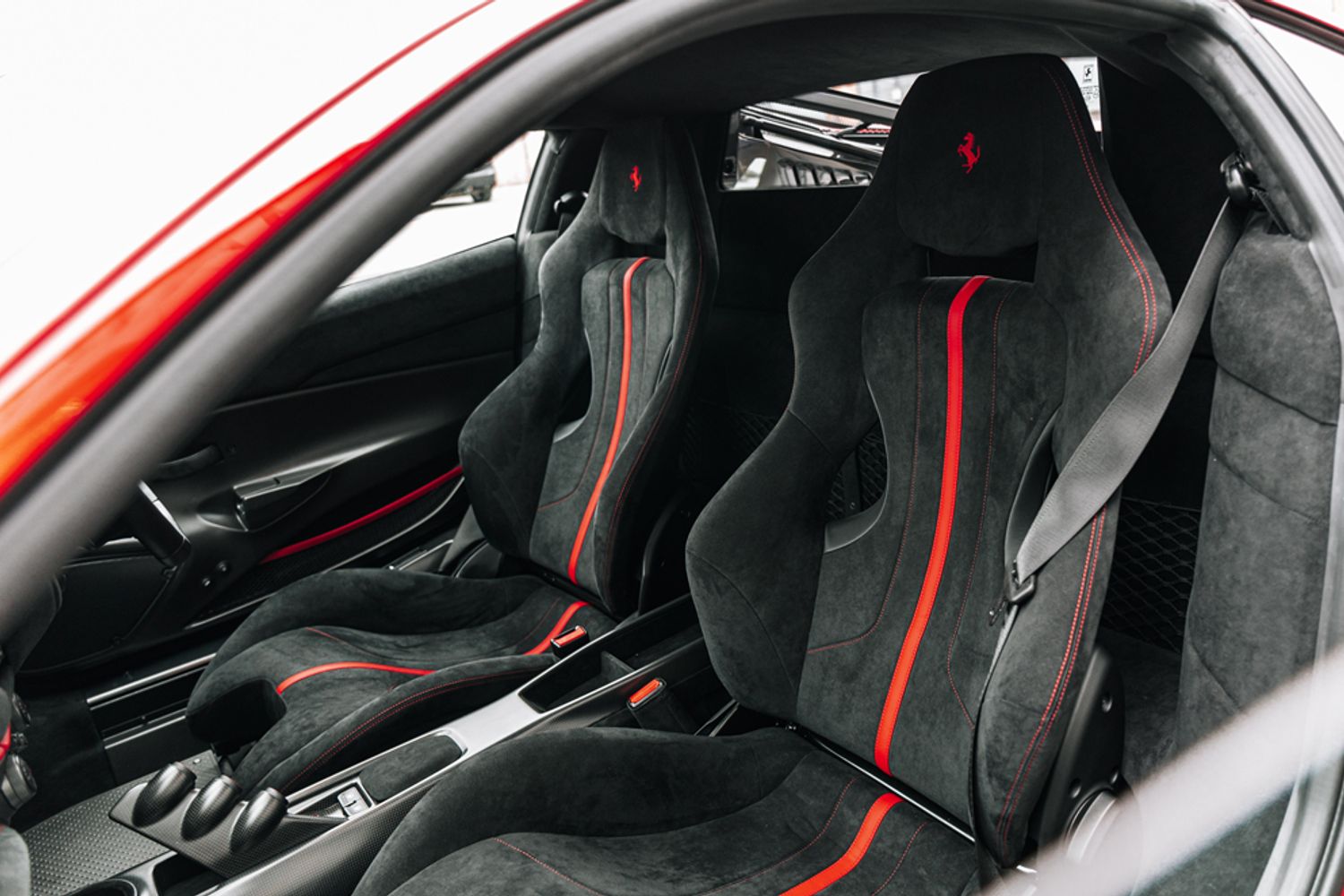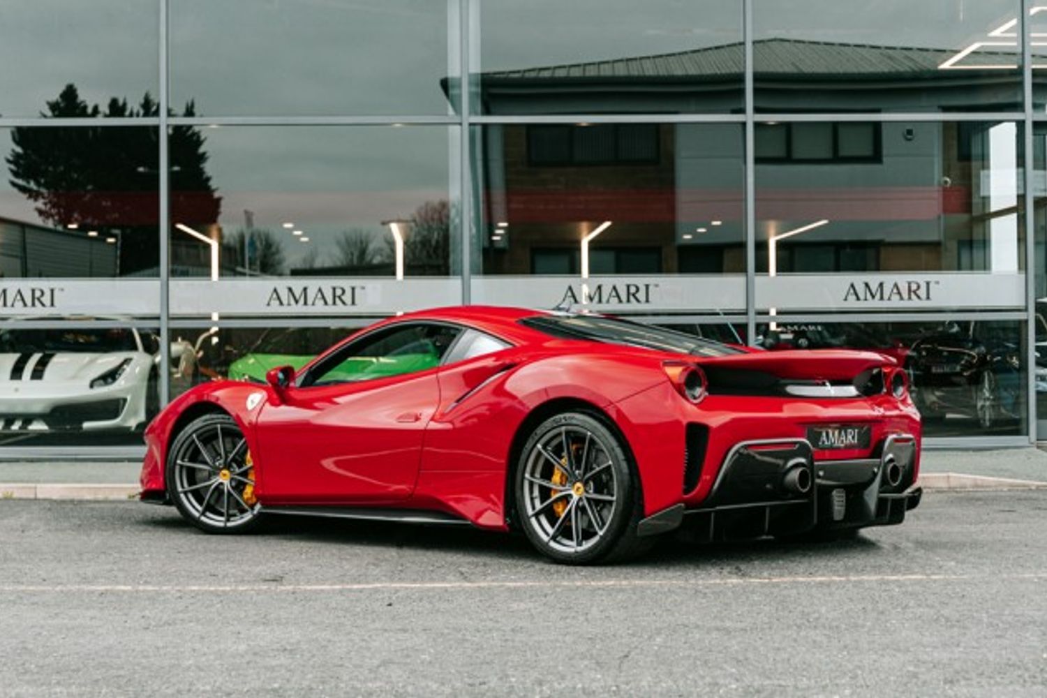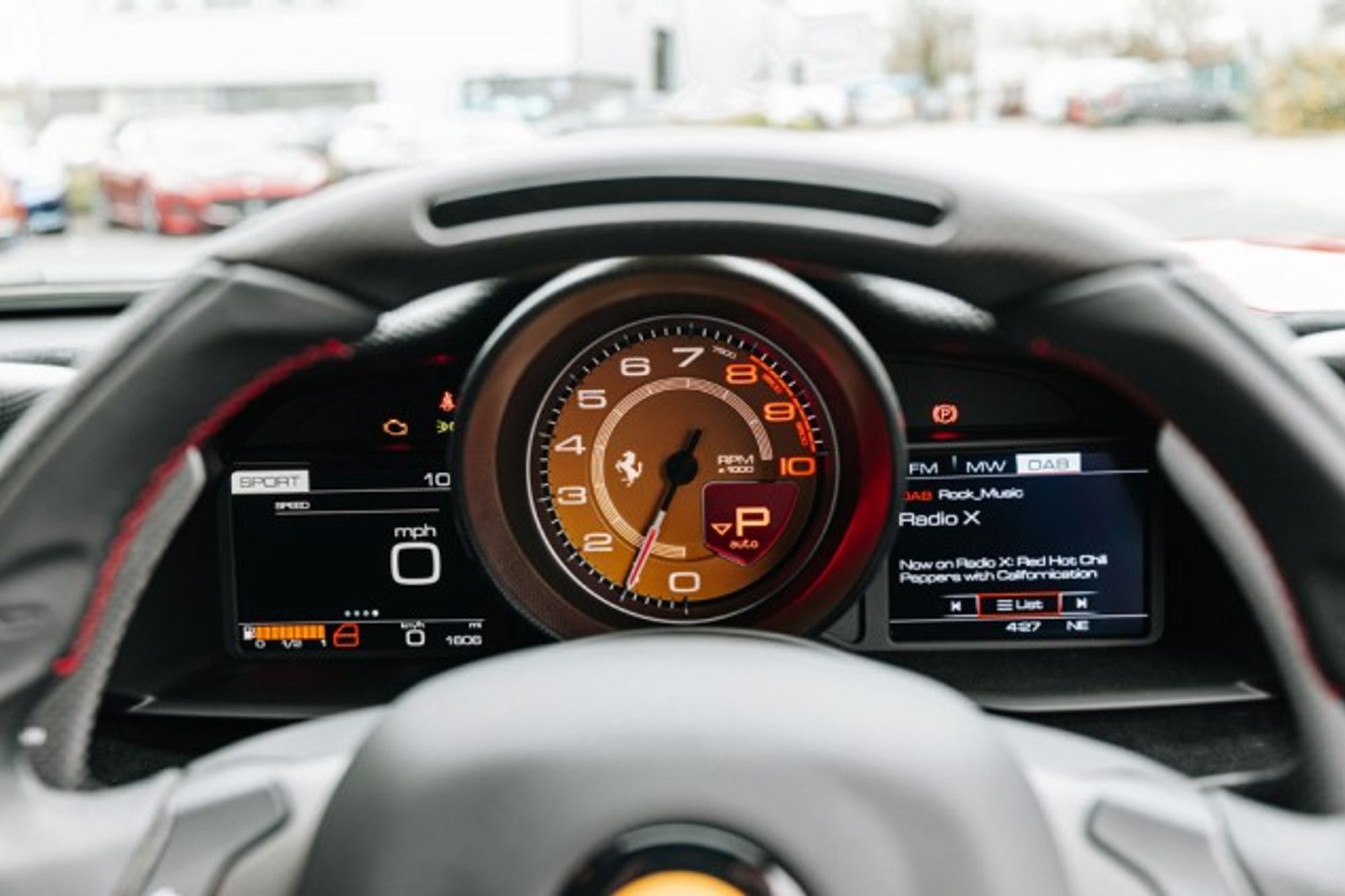 This particular example of the Ferrari 488 Pista was supplied new to the UK in June 2019, 19 Registered. Finished in the extra range, Rosso Corsa Metallic, with the Two-Tone Stripe in Argento Nurburgring, featuring extensive Carbon Fibre optional extras. The interior is upholstered in Nero Alcantara with contrasting Rosso Details and Stitching. This vehicle has covered 1,606 Miles by 1 Owner from new. The already huge specification is the Ferrari 488 Pista is vastly enhanced by the following options, outlined below:
