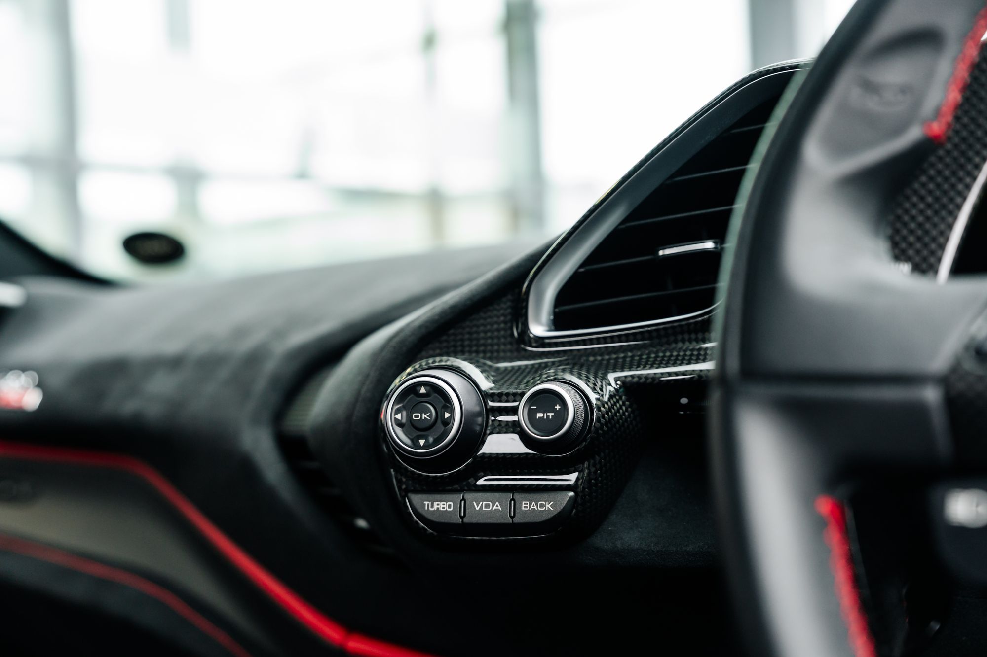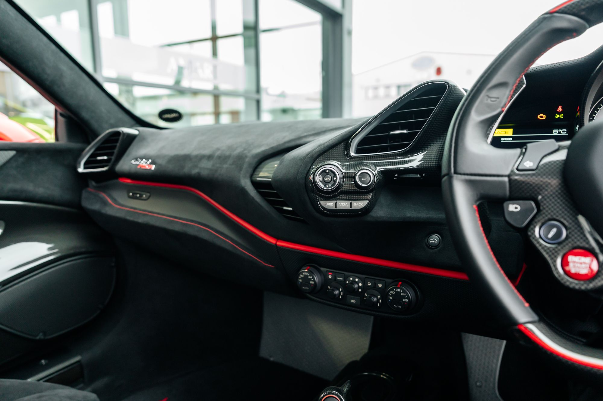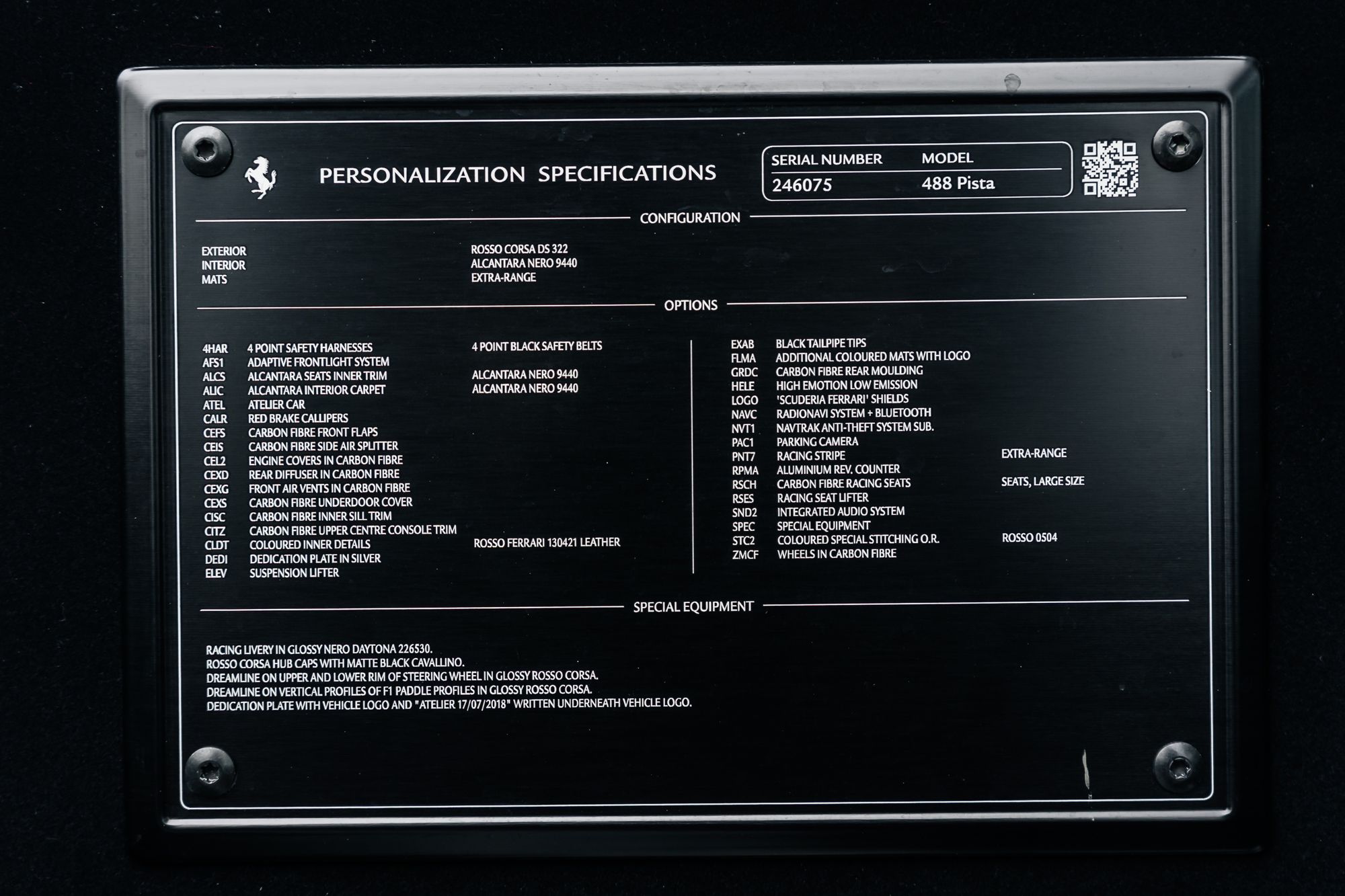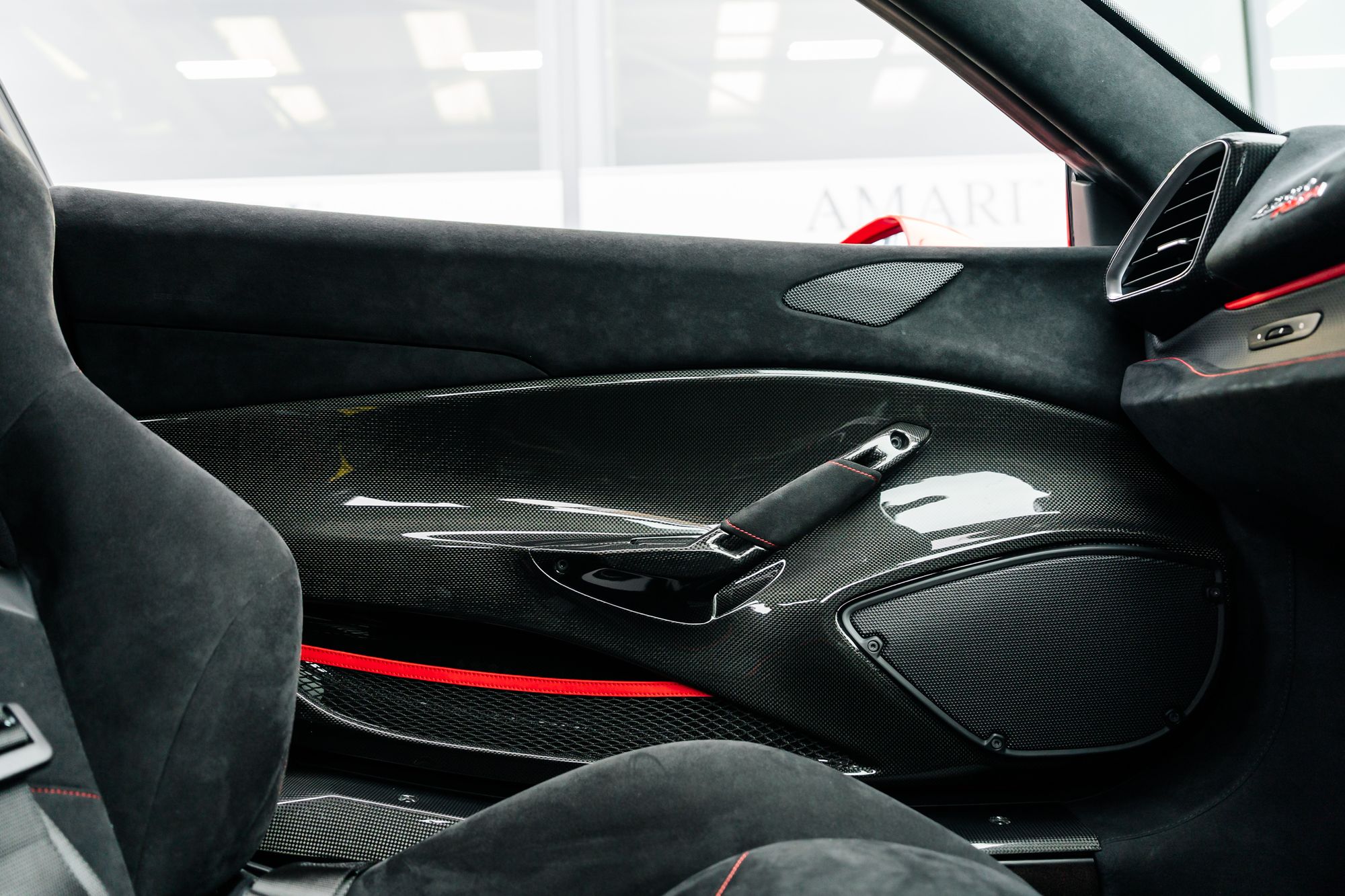 This particular example is an Atelier car, registered June 2019 (19), and represents a truly outstanding specification. Finished in Rosso Corsa with a striking Racing Livery in Glossy Nero Daytona, the exterior is further elevated by an exceptional array of exposed carbon fibre components, including front flaps, side air splitters, engine covers, rear diffuser, front air vents, underdoor covers, inner sill trim, rear moulding and even carbon fibre wheels. Inside, the cabin is trimmed in Alcantara Nero with carbon fibre racing seats (large size), 4-point black safety harnesses, aluminium rev counter, Rosso Ferrari leather inner details and Rosso contrast stitching. The bespoke nature of this car is underlined by multiple dedication plates marked ‘Atelier 17/07/2018’, dreamline detailing in Glossy Rosso Corsa on the steering wheel and F1 paddles, and a vast list of special equipment including suspension lifter, parking camera, carbon ceramic brakes with red calipers, Scuderia Ferrari shields, navigation with Bluetooth, and NavTrak anti-theft system. Offered with a full Ferrari service history.