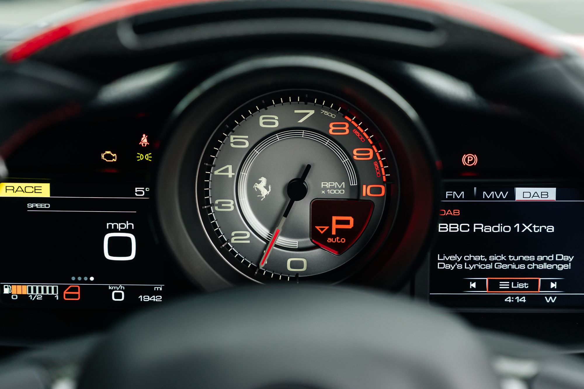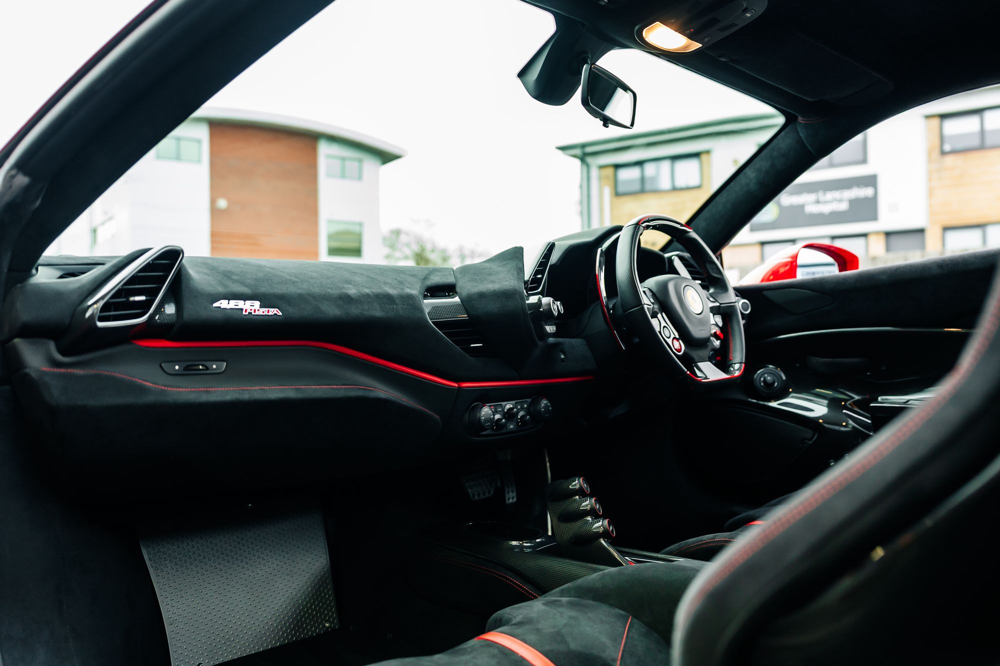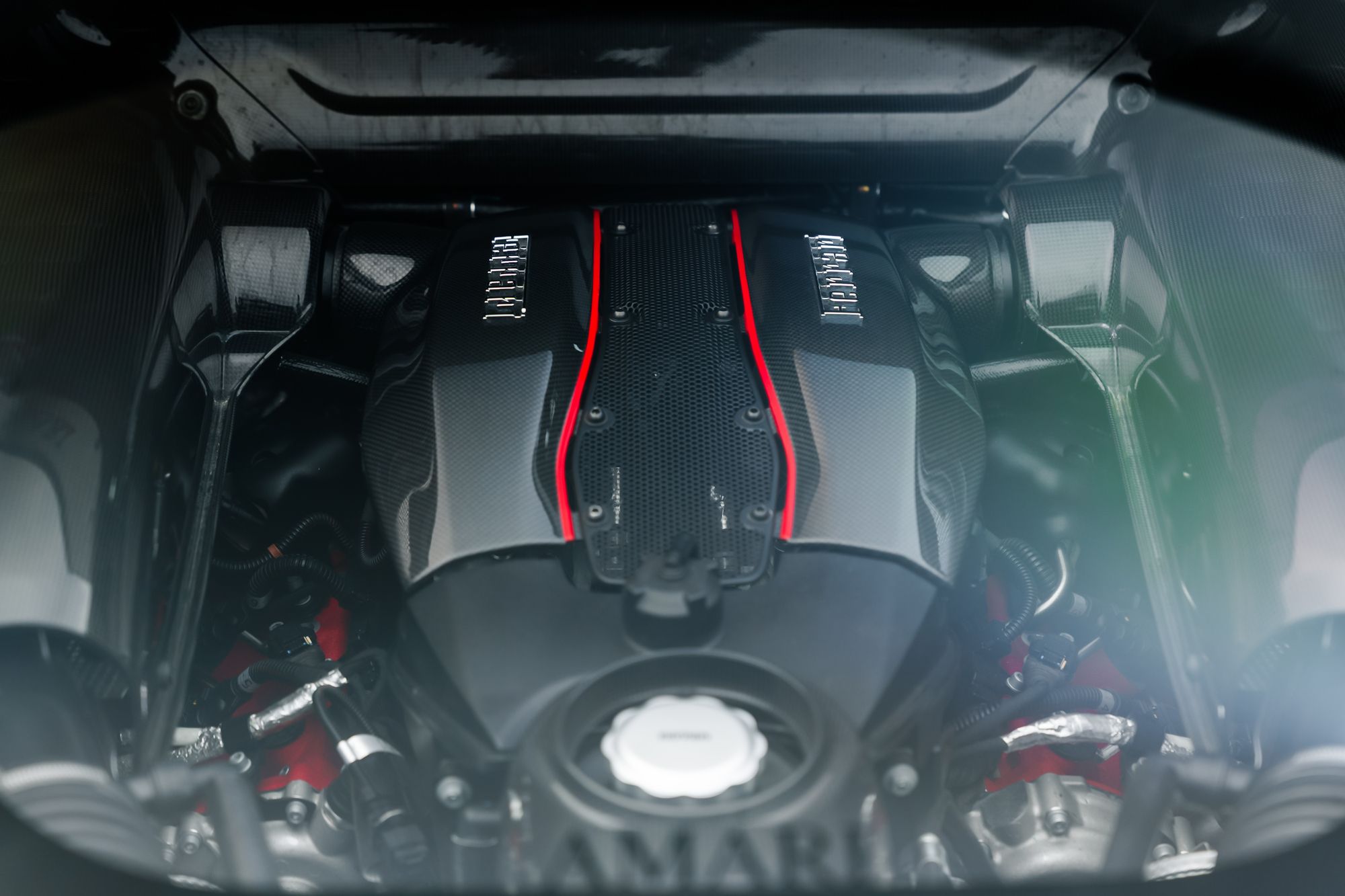 This particular example is an Atelier car, registered June 2019 (19), and represents a truly outstanding specification. Finished in Rosso Corsa with a striking Racing Livery in Glossy Nero Daytona, the exterior is further elevated by an exceptional array of exposed carbon fibre components, including front flaps, side air splitters, engine covers, rear diffuser, front air vents, underdoor covers, inner sill trim, rear moulding and even carbon fibre wheels. Inside, the cabin is trimmed in Alcantara Nero with carbon fibre racing seats (large size), 4-point black safety harnesses, aluminium rev counter, Rosso Ferrari leather inner details and Rosso contrast stitching. The bespoke nature of this car is underlined by multiple dedication plates marked ‘Atelier 17/07/2018’, dreamline detailing in Glossy Rosso Corsa on the steering wheel and F1 paddles, and a vast list of special equipment including suspension lifter, parking camera, carbon ceramic brakes with red calipers, Scuderia Ferrari shields, navigation with Bluetooth, and NavTrak anti-theft system. Offered with a full Ferrari service history.