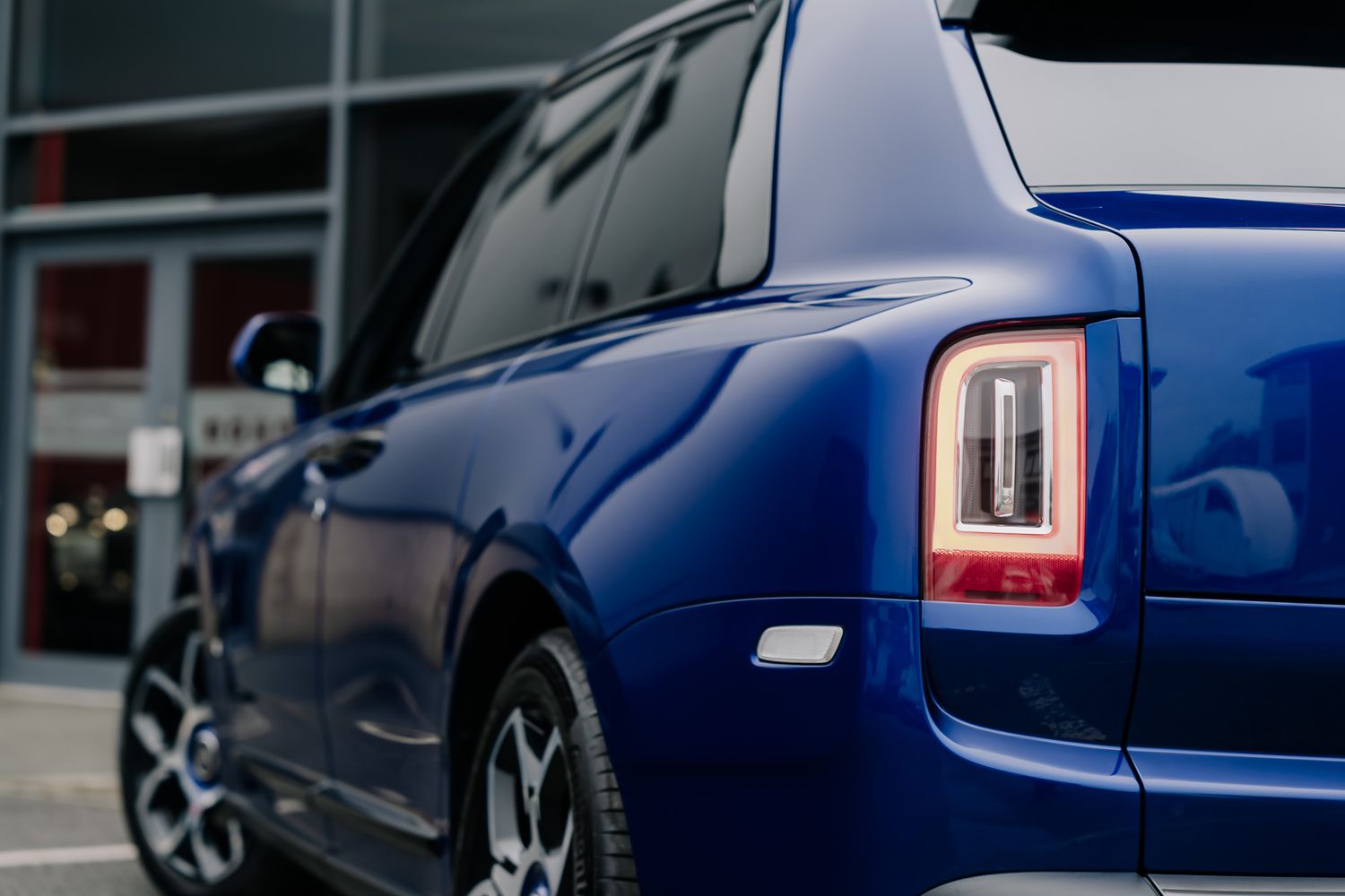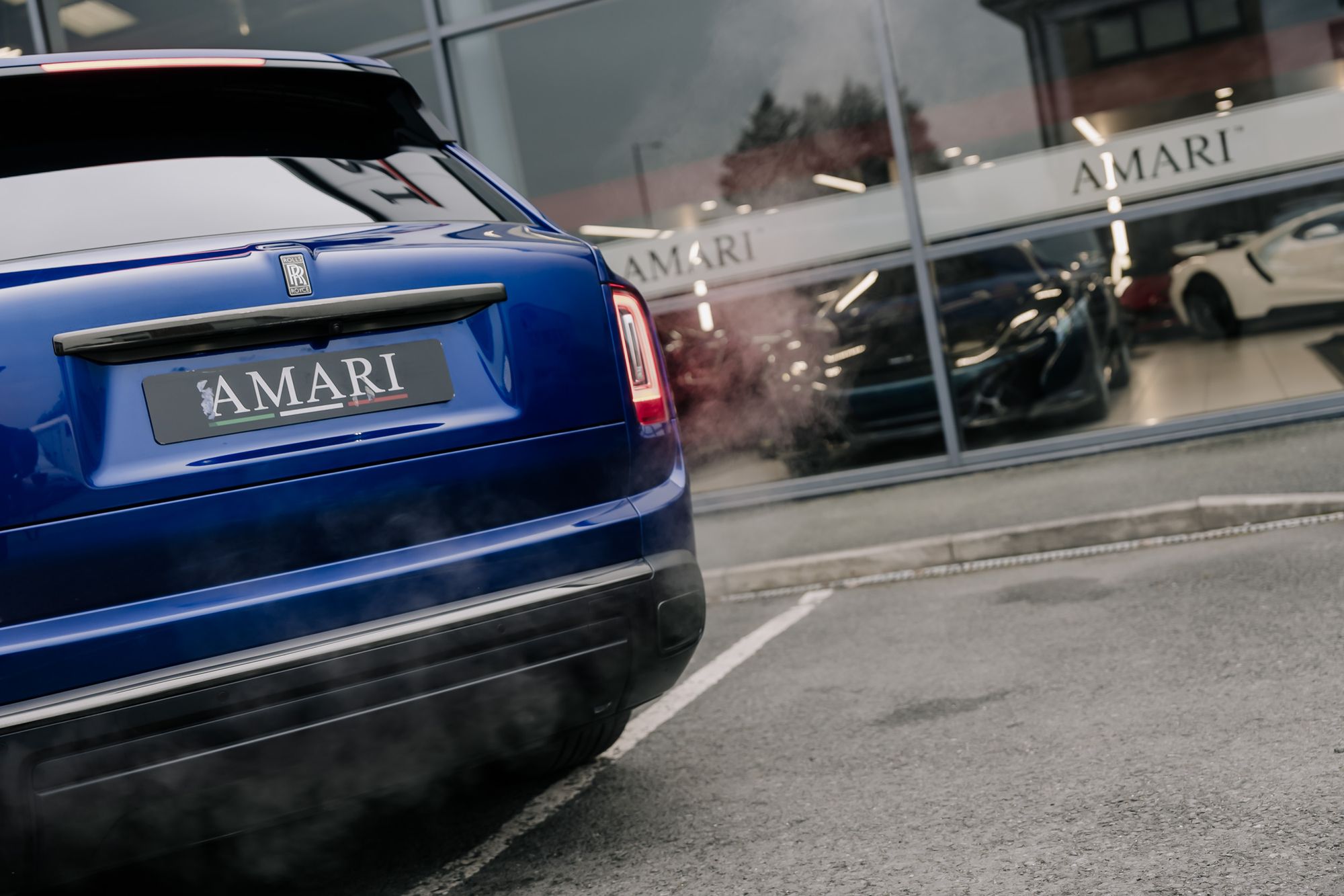 The stunning 2019 Rolls-Royce Cullinan Black Badge, a true embodiment of luxury and power. The exterior of this exceptional vehicle boasts an eye-catching Salamanca blue colour, accentuating its commanding presence on the road. As you approach, you'll be captivated by the Dark Chrome Spirit of Ecstasy, a distinctive emblem of Rolls-Royce excellence that graces the hood with elegance and style. The chrome plated visible exhausts add a touch of sophistication to the rear, showcasing the meticulous attention to detail.