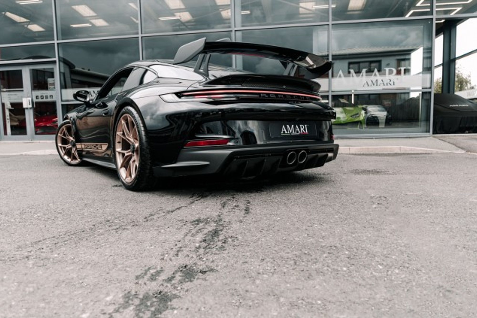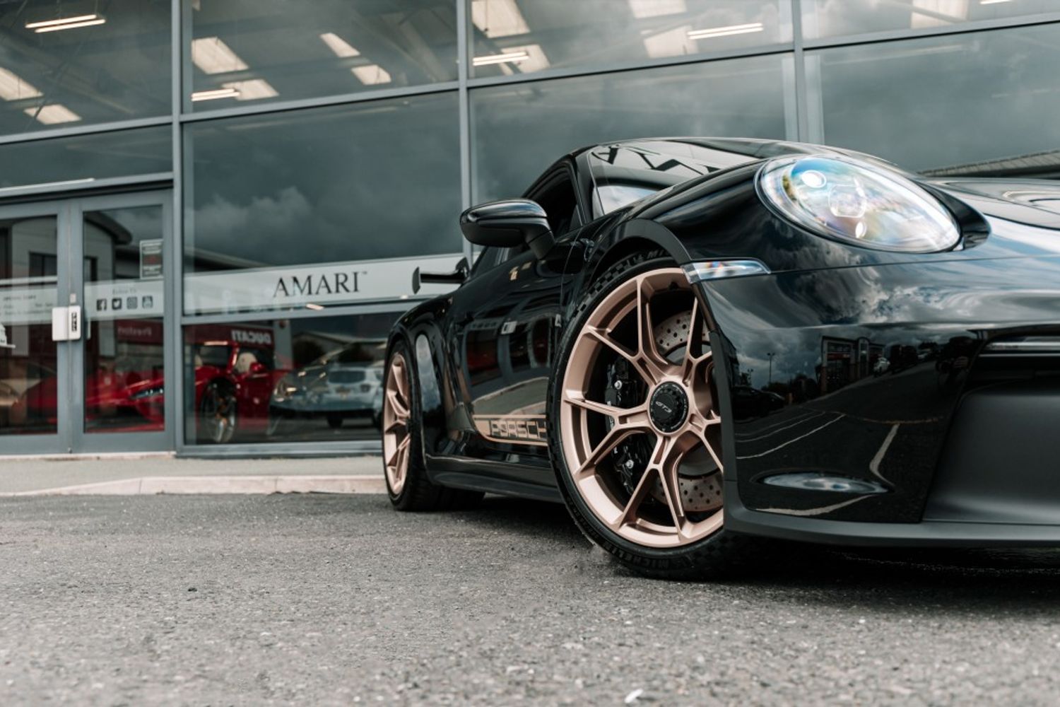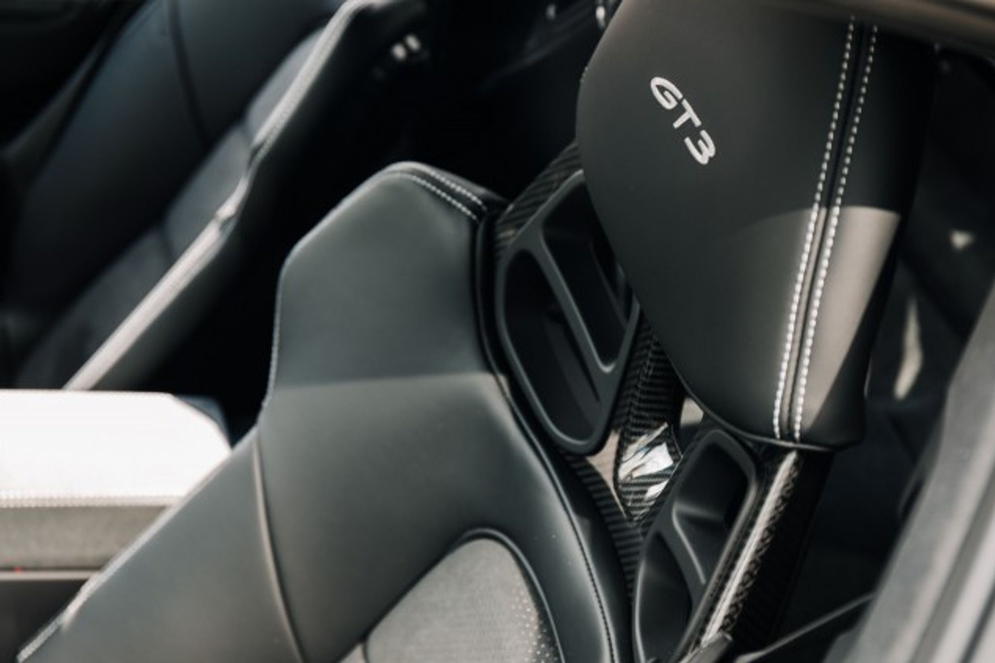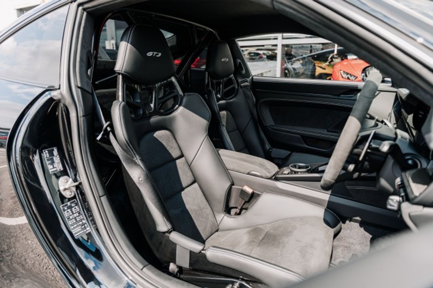 This particular example of the Porsche 911 992 GT3, is truly a unique as well as being one of the first examples. Supplied new in July 2021, 21 Registered. Presented to you in Black, boasting the Lightweight Carbon Roof, featuring the Decorative Motorsport Stickers in Aurum. The interior is upholstered in Black Leather with contrasting colour in GT Silver, also boasting the Carbon Interior Package (High-Gloss). This example has covered only Delivery Mileage with 1 Registered Keeper. The extensive specification is outlined below: