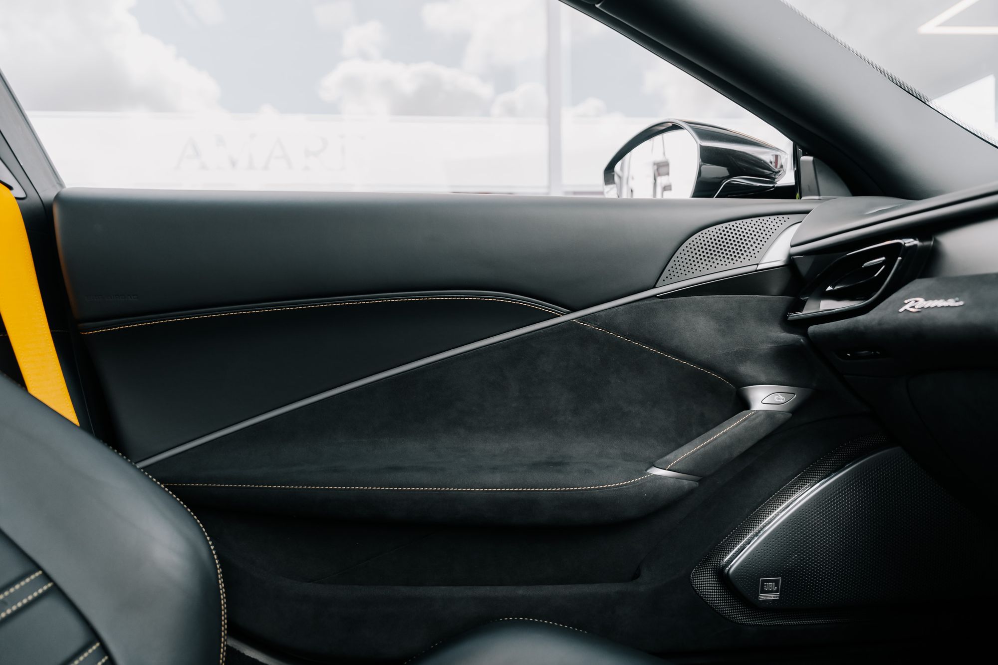 The car's seats are adorned with a tasteful touch - the iconic Cavallino logo, beautifully stitched on the headrest in Giallo, adding a dash of Ferrari's racing heritage. The attention to detail is unparalleled with black tailpipe tips, a carbon fiber steering wheel with LEDs, and Scuderia Ferrari shields, making it unmistakably a symbol of automotive excellence.