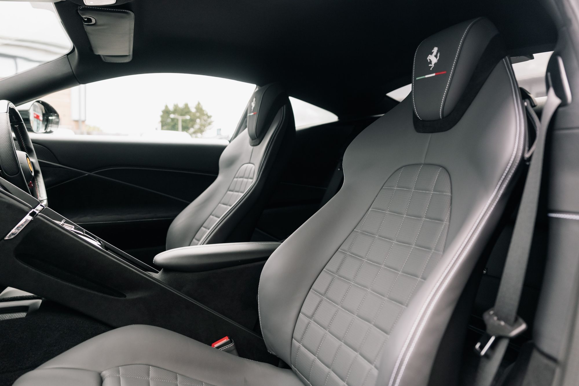 Inside the cabin, you'll find exquisite Italian craftsmanship and attention to detail. The headrests are adorned with elegant Italian Flag embroidery, showcasing the car's proud heritage. The tricolore dreamline on the carbon fibre F1 gearshift paddles adds a touch of sportiness, complemented by the tricolore stitching on the steering wheel. The upper part of the centre console, dash inserts, and steering wheel feature carbon fibre, exuding a sense of luxury and high performance.