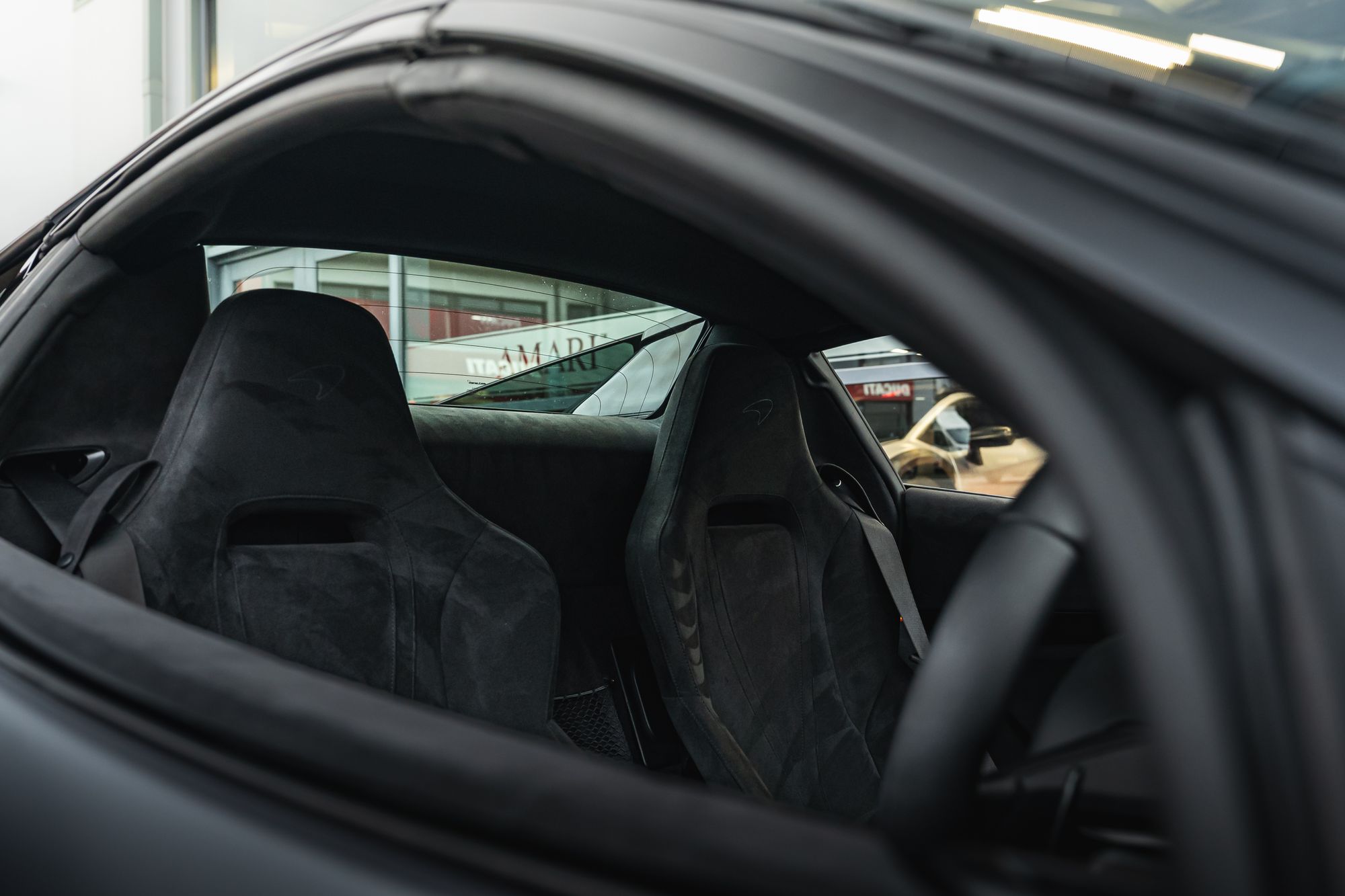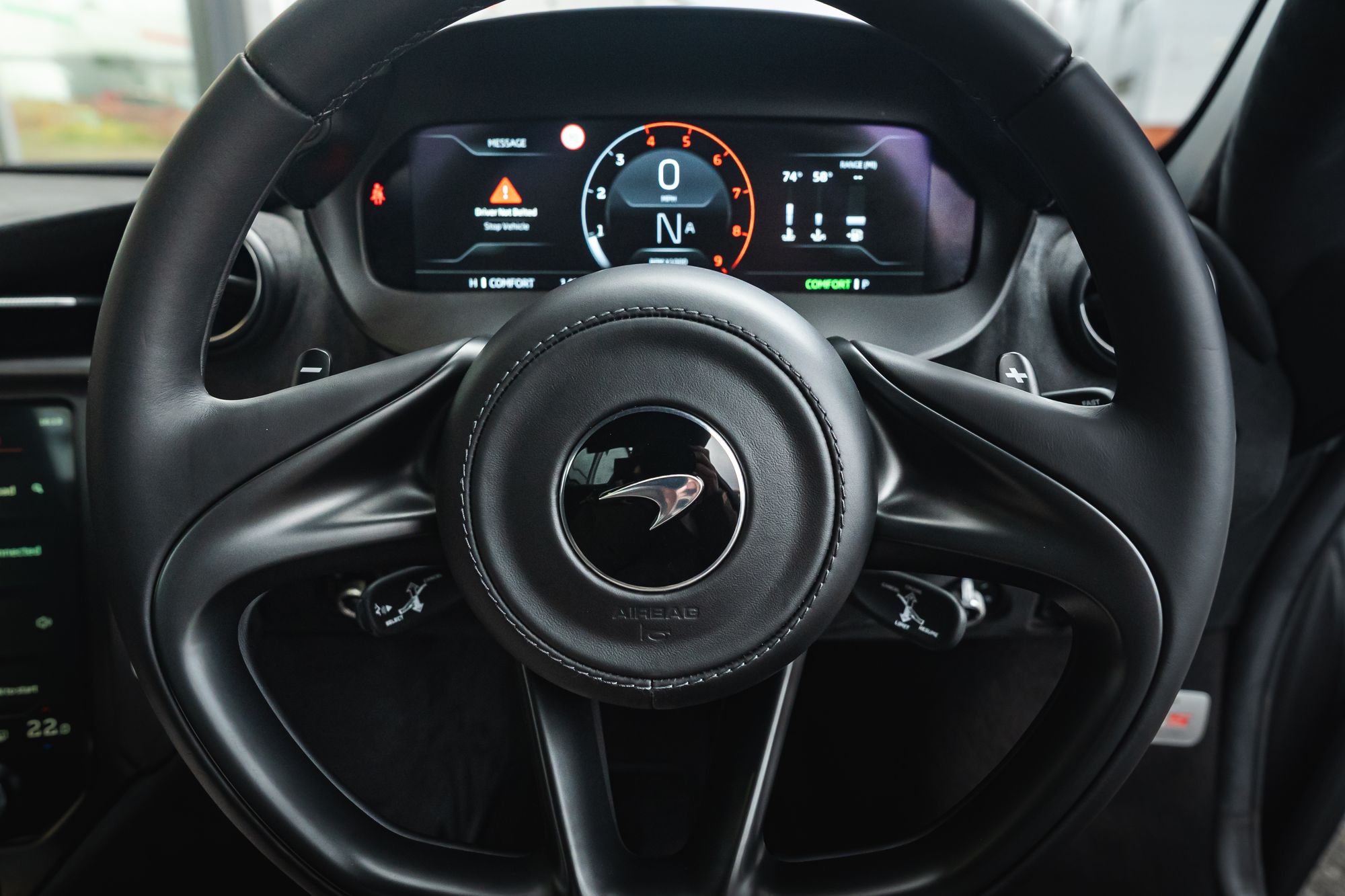 Inside, the cabin is trimmed in full Carbon Black Alcantara, creating a focused and contemporary driving environment. Technology is seamlessly integrated via the 8-inch high-resolution touchscreen, McLaren Infotainment System II, navigation with 3D cluster display, Bluetooth telephony, DAB radio and Apple CarPlay smartphone integration. Comfort and convenience are enhanced with cruise control, soft-close doors, carbon black carpet sill trim and a factory-fitted vehicle tracking system.